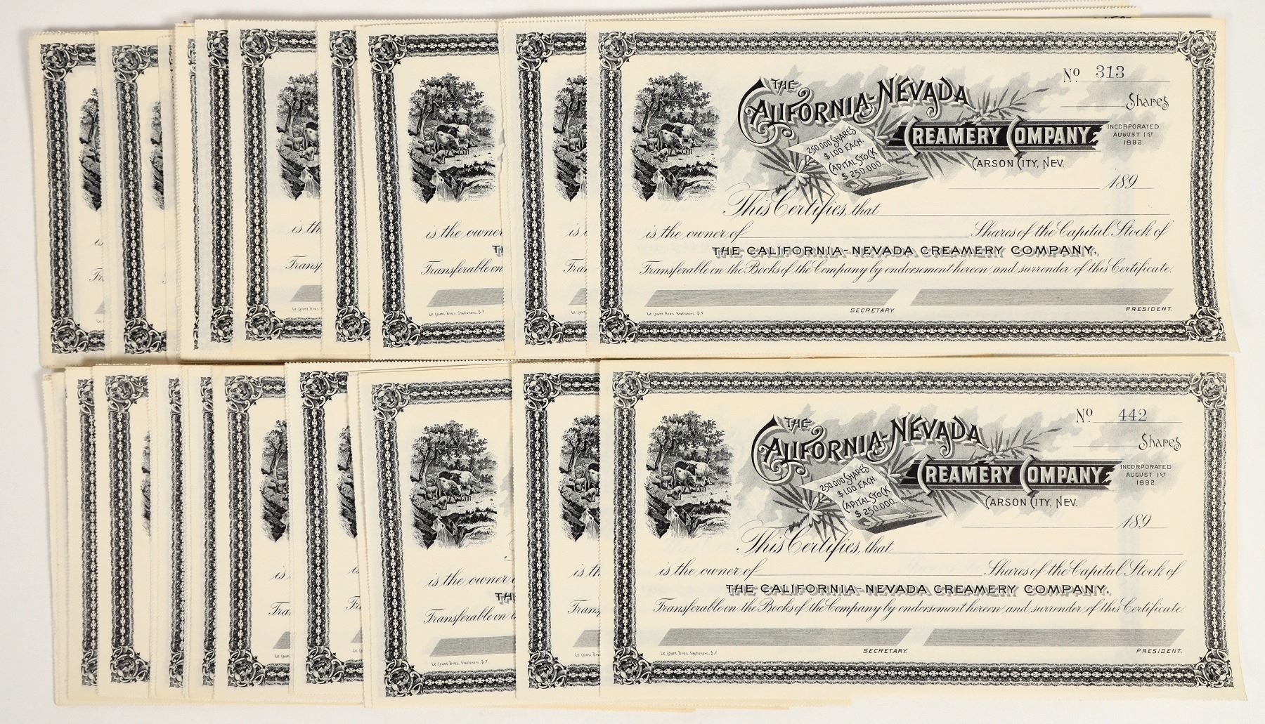 About 50 California-Nevada Creamery Company Stocks. Unissued. This company made and sold condensed milk, cheese, and butter from milk supplied by member farms in the Carson, Mason and Smith Valleys, Nevada; Lyon County, Nevada; and Novato, in Marin County, California. In 1892, they became the California-Nevada Creamery Company. TR Hofer was an important banking figure in Carson City and also once served as the superintendent for the Carson City Mint.