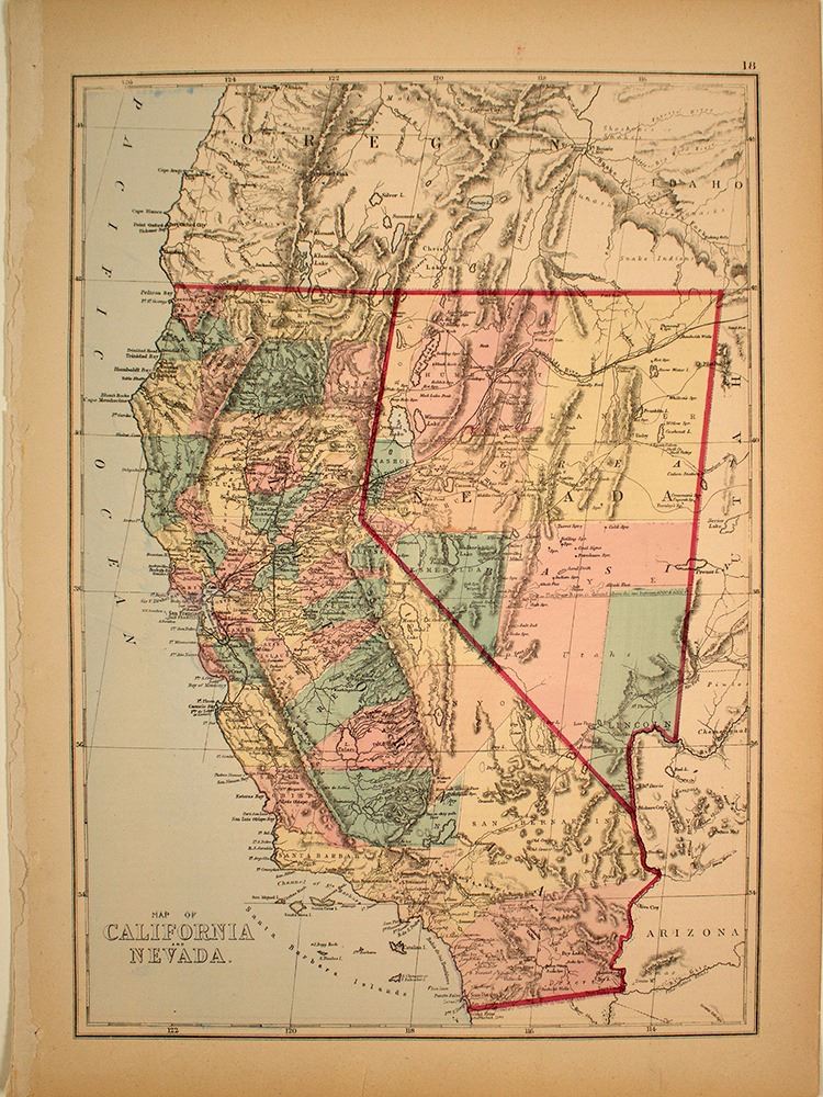 19.5 x 14". Page 18 from a book. Excellent condition. Notice in Nevada there is no White Pine County and no Clark County. c1863 or 1864. State: California / Nevada City: Date: FHWAC#: 41836
