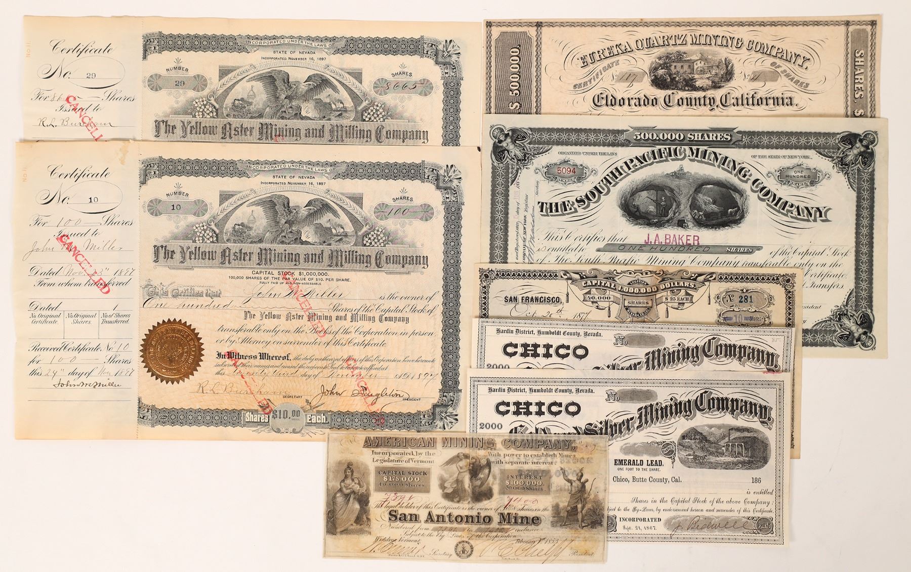 Lot of eight stock certificates from early California & Nevada mining ventures: 1) Eureka Quartz Mining Company, 1853, El Dorado County. Certificate #107 issued January 24th 1853 as a bearer certificate for four shares, signed James A. Shorb as President and E. H. Cornwall as Secretary. Printed by Geo. E. Leefe, New York. 2) San Antonio Mine: American Mining Company venture located in San Jose; datelined Windsor, Vermont February 1, 1853. Three vignettes, one of the earliest California mining stock certificates. Very rare. 3 & 4) two from The Yellow Aster Mining and Milling Company, 1897, signed by president John Singleton, issued for 100 shares and 8665 shares. 5) Selby Hill Mining company, San Francisco, 1877, for ten shares. 6) The South Pacific Mining Company, for one hundred shares, 1882, mining vignette. 7 & 8) Chico Gold and Silver Mining Company, Hardin district, Humboldt County, Nevada; two unissued, but one signed by John Bidwell, president.