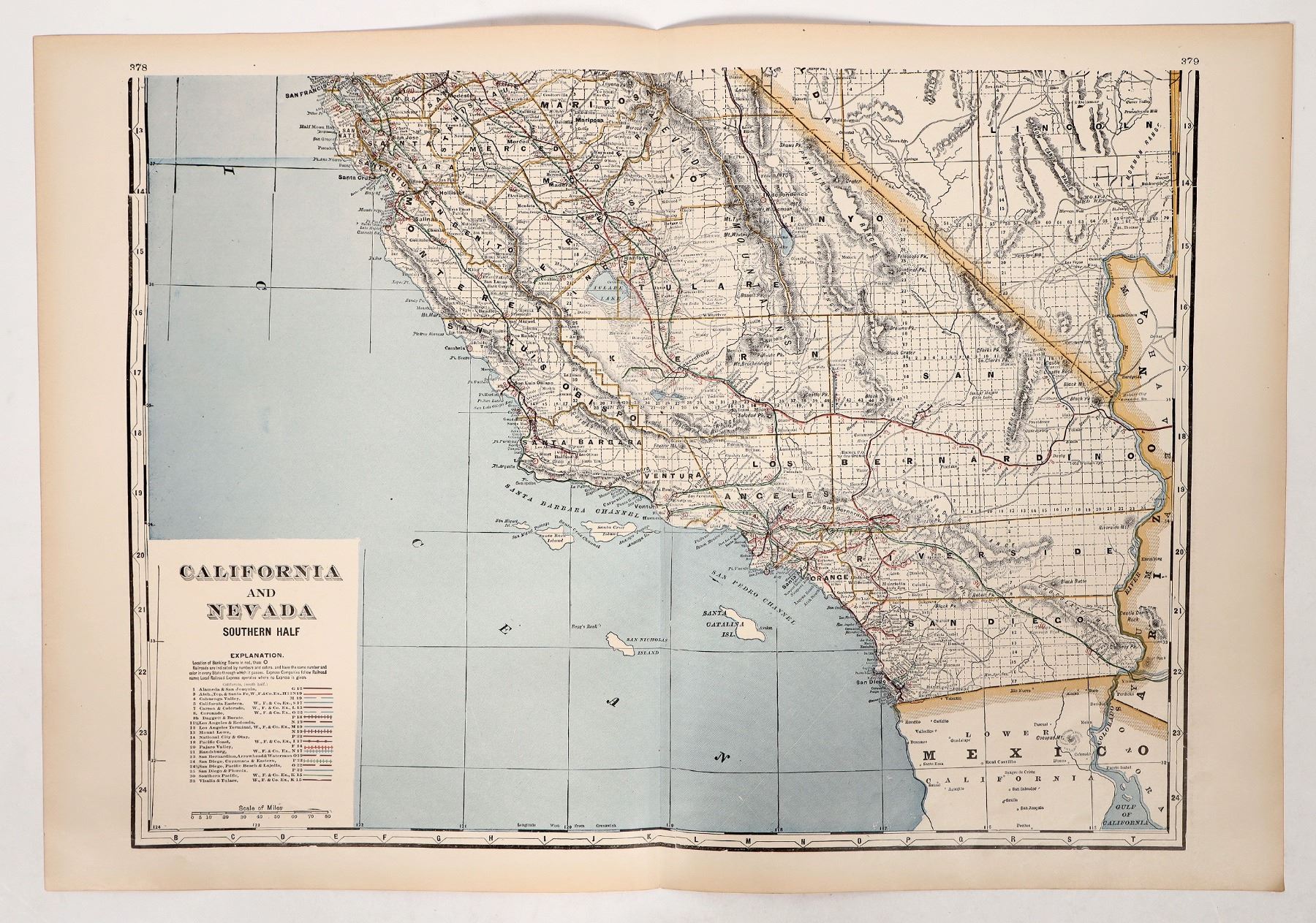 A detailed railway map of southern California and Nevada, c. 1880s-1910s. The opposite side of the map has an index of California cities with their nearest railway or railway station. The map distinguishes rails by railway company and includes county lines and geographical features. Excellent condition.