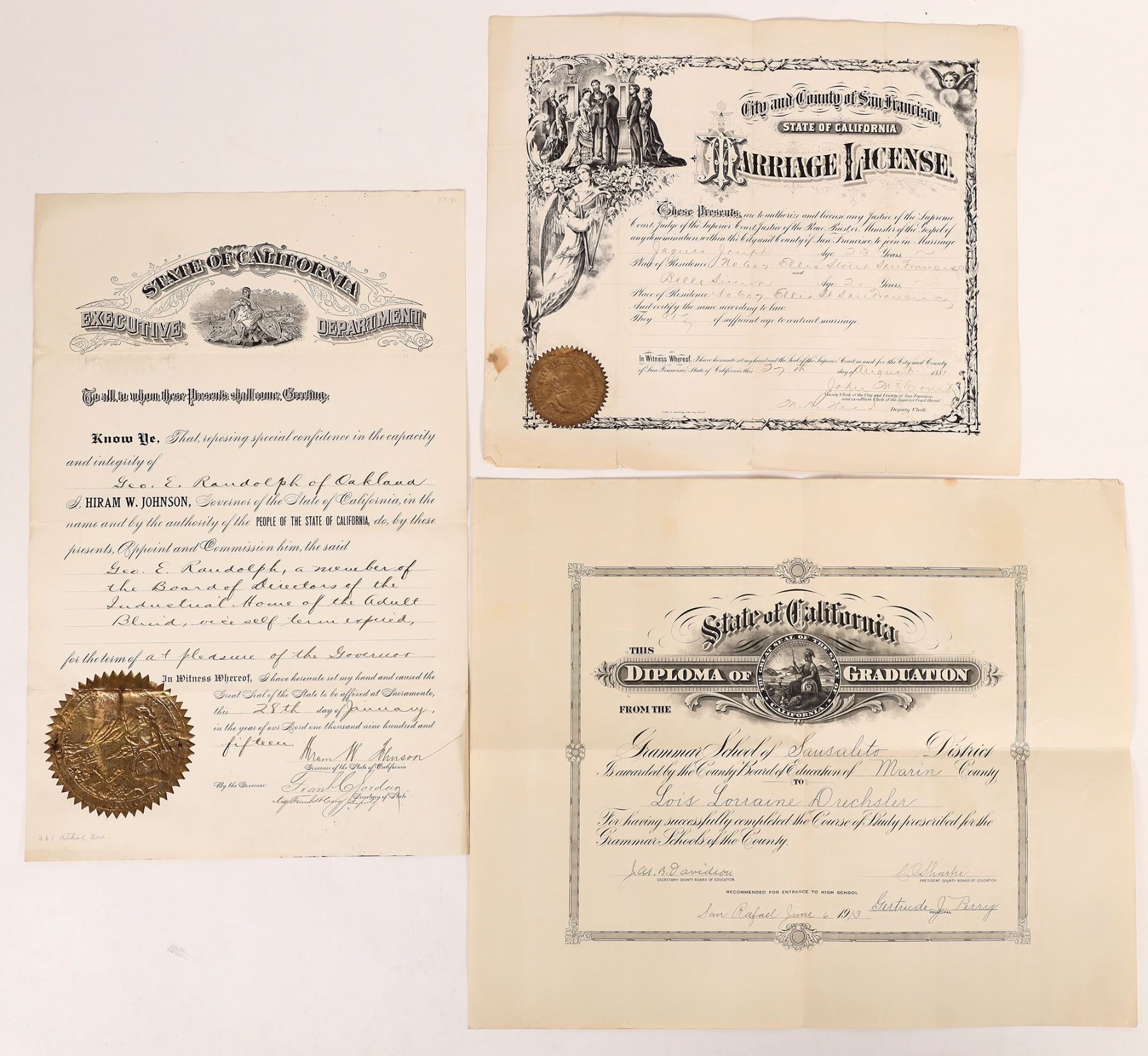 Lot of 3. 1) State of California Executive Department appointing Geo. Randolph in 1915. Signed by governor Hiram Johnson. Allegorical vignette and large gold seal. 17 x 11" 2) San Francisco City & County marriage license issued in 1881 to Jacques Joseph. Signed by the county clerk and deputy clerk. Nice marriage vignettes. Lith. WT Galloway. 12 x 14" 3) Sausalito District graduation diploma, 1913, San Rafael. State seal vignette. 14 x17" California 1881-1915
