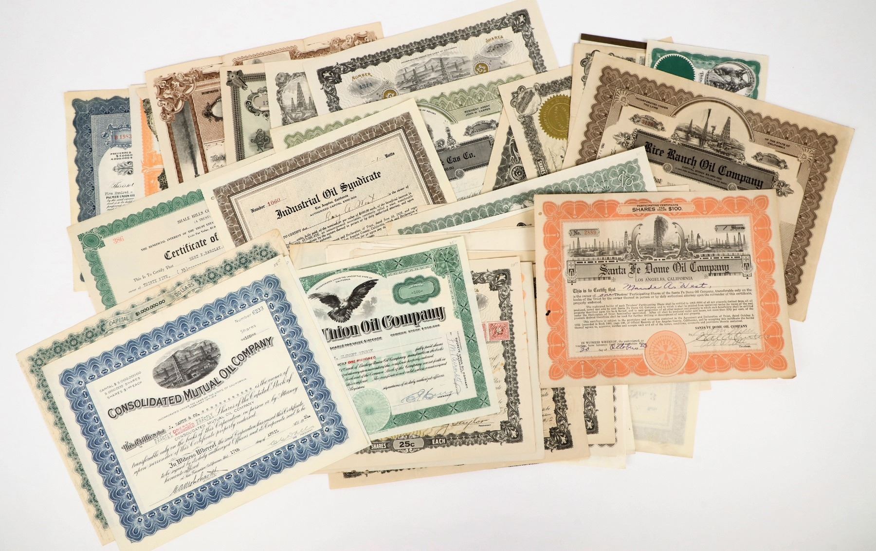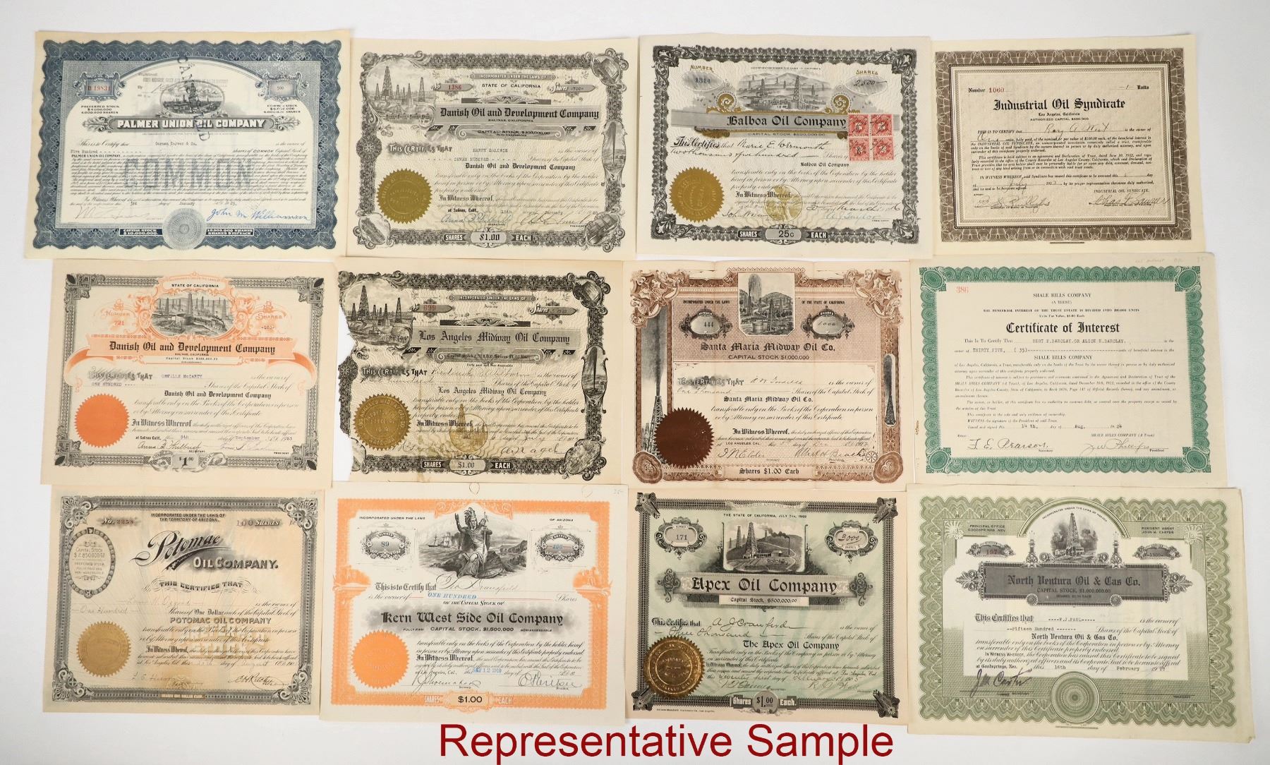 Lot of 43. U/U, I/U, I/C. Issued 1902-31. Fine or better. Some with revenue stamps. I/E/; Santa Fe Dome Oil Co.., Petaluma Oil & Burner Co. ,Oil Creek Petroleum Co , Consolidated Mutual oil Co. , Palmer Union Oil Co. , Alameda Oil Co. Limited , Balboa Oil Co. and more.