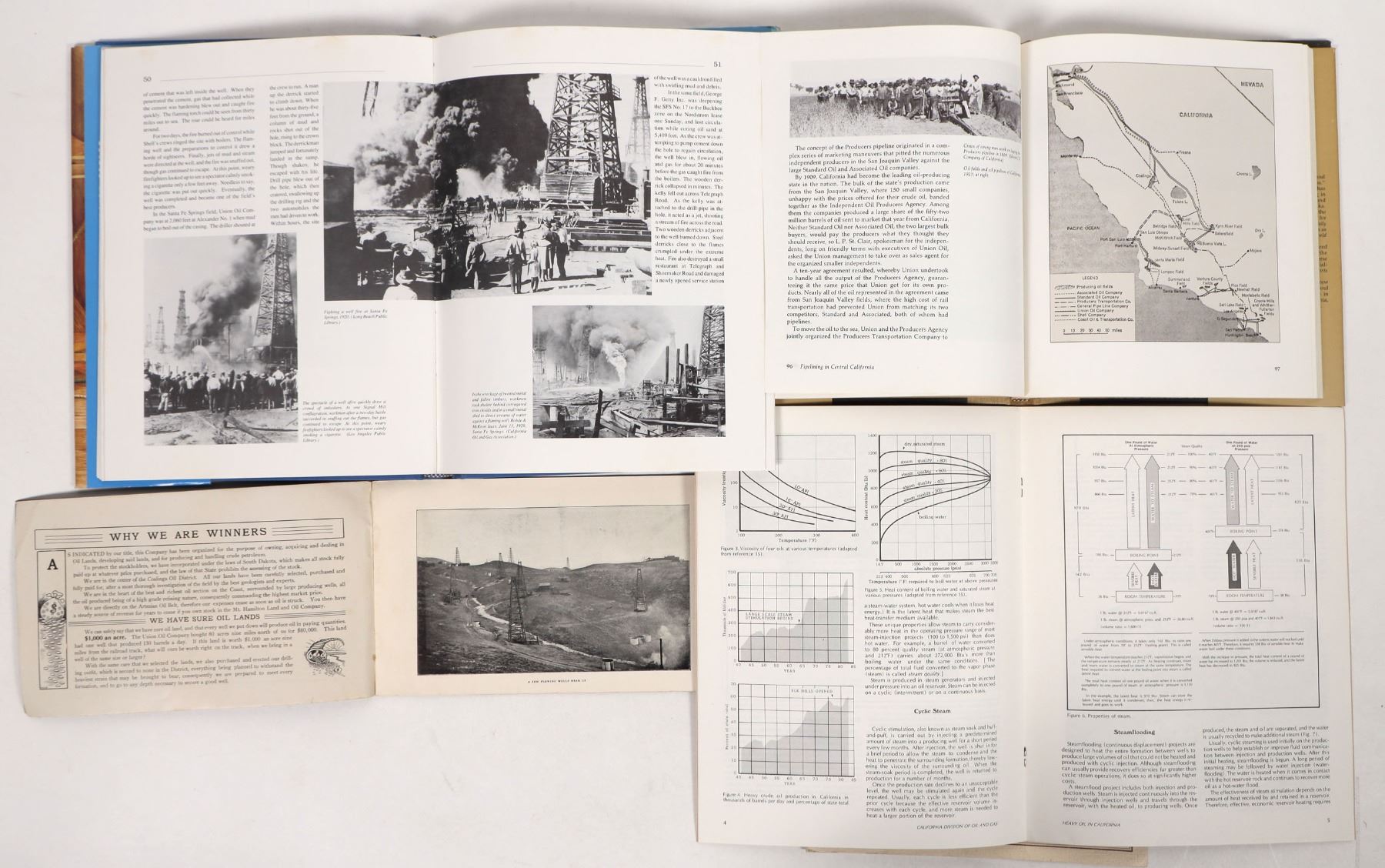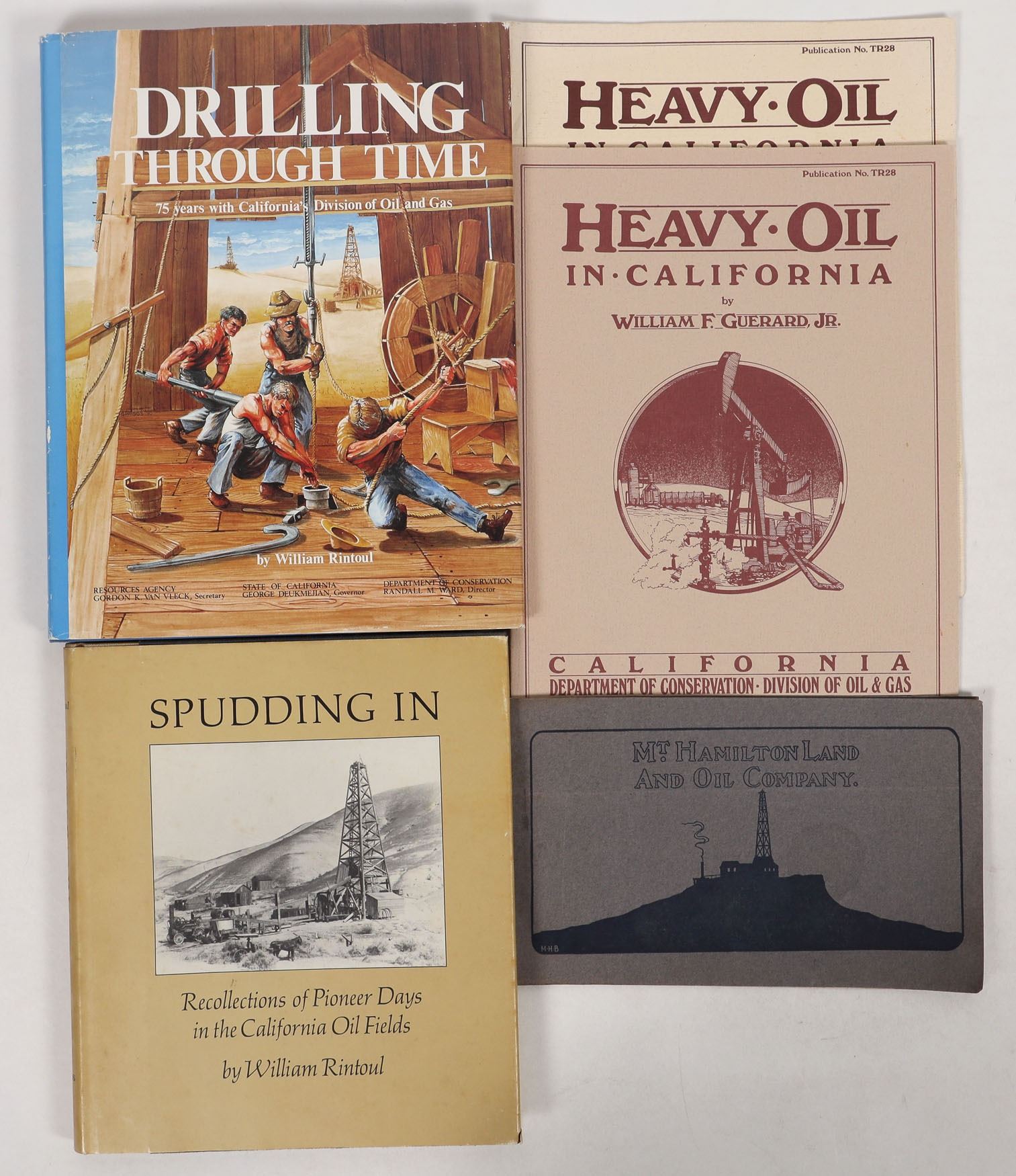 A group of two books and three booklets on California's oil industry, dating 1903 to 1998. The books, both by oil journalist William Rintoul, are 'Spudding In: Recollections of Pioneer Days in the California Oil Fields' (1976) and 'Drilling Through Time: 75 years with California's Division of Oil and Gas' (1990). The booklets are a 1903 piece advertising stock in the Mt. Hamilton Land and Oil Company and two copies of Heavy Oil in California (1998) by William F. Guerard Jr., which describes the science and mechanics of oil drilling. All items are in great condition.