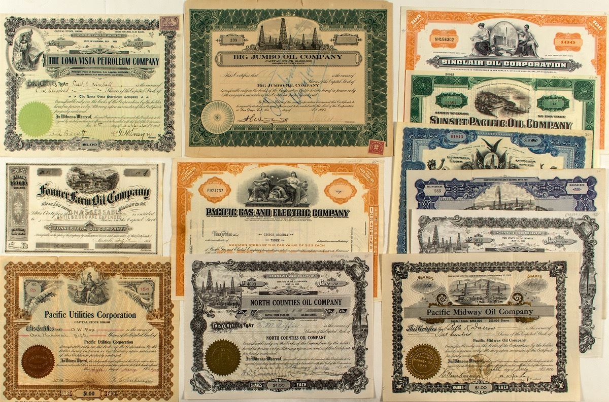 Lot of 12. Best is a pictorial Fonner Farm Oil Company stock (Humboldt County, 1866, not cancelled). Also: Loma Vista Petroleum Co. (1900, not cxl), Pacific Utilities Corp (1909, not cxl), Big Jumbo Oil Co. (1922, pen cxl, oil derrick vignette), Sunset Pacific Oil Co. (1929, not cxl, refinery vignette), Pacific Gas & Electric Co. (not cxl), Sinclair Oil Corp. (1965, punched), Pacific Midway Oil Co. (1910, not cxl, oil field vignette), North Counties Oil Co. (1937 & 1939, not cxl, oil vignette), Tuscan Oil Co. (1921, not cancelled, great oil vignette), and Palmer Union Oil Co. (1912, punched). (Prag Collection) City: State: California Date: 1866-1965 ID# 34511