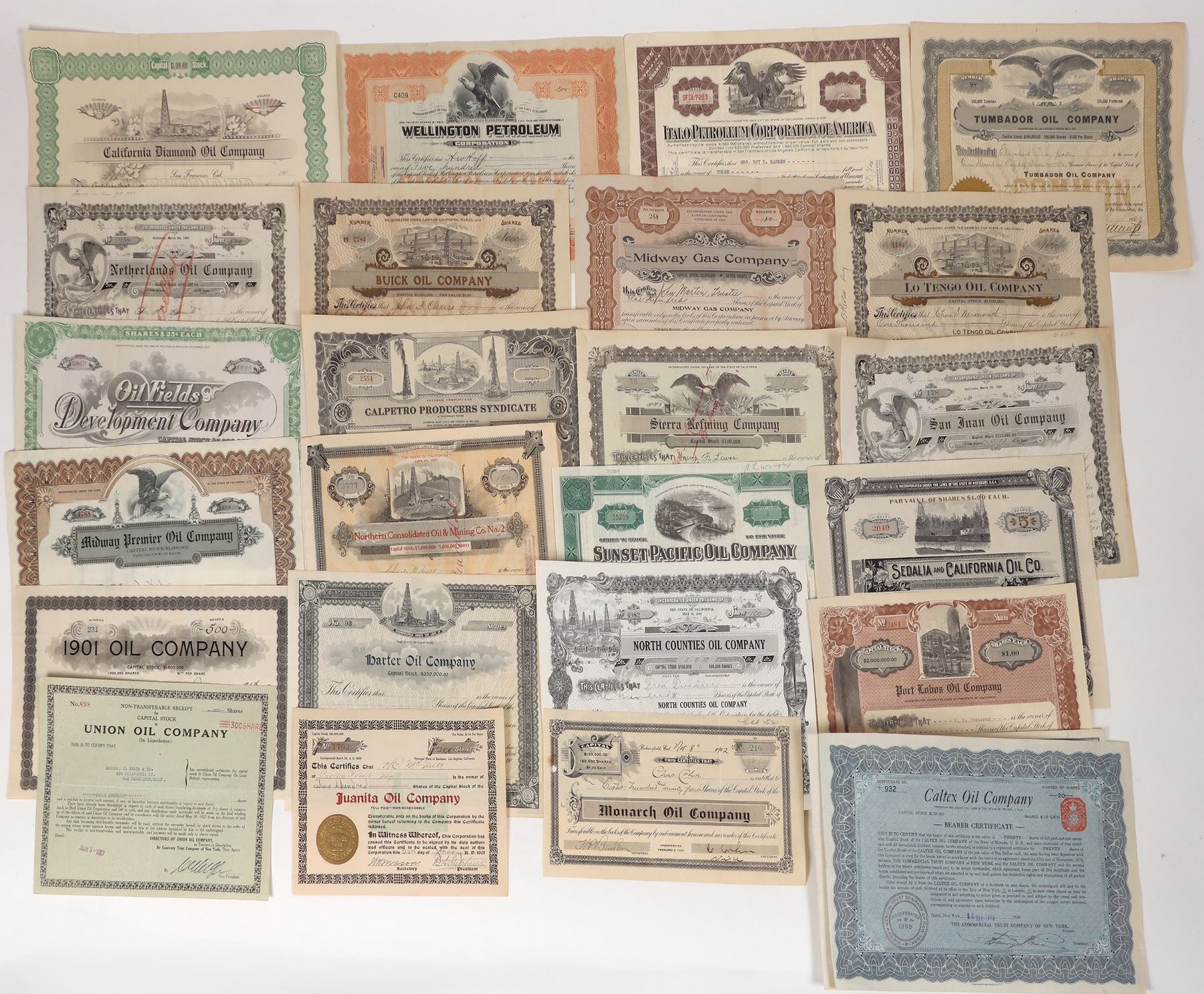 About 20 different California oil stocks, 1901-48. Sierra Refining, San Juan Oil, Midway Premier Oil, California Diamond Oil, Sunset Pacific, Sedalia and California Oil, Port Lobos, 1901 Oil, Calpetro Producers Syndicate, Juanita Oil, Monarch Oil etc. See Photo.