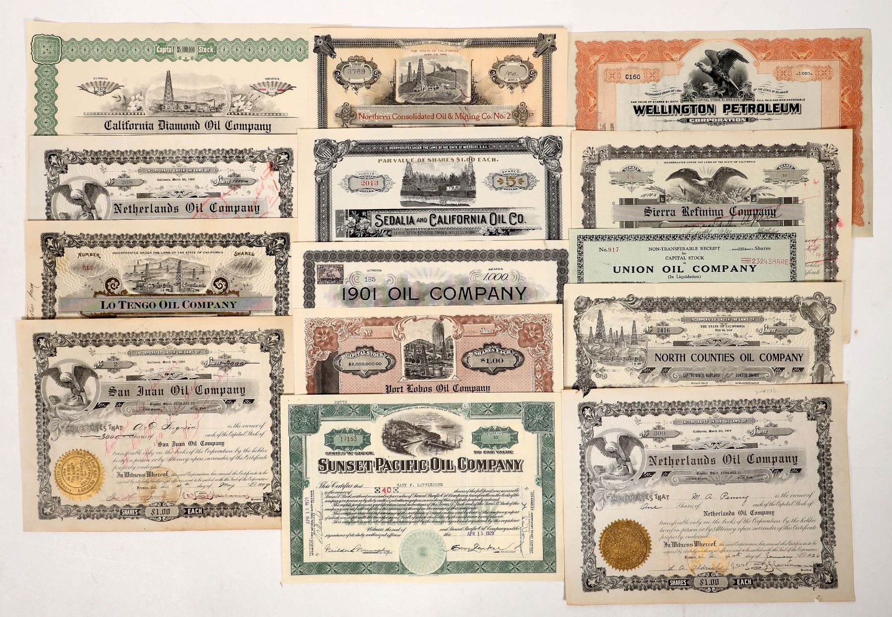 A group of 14 stock certificates from thirteen different California-based oil companies, dating from 1900 to 1929. All certificates in the lot are issued; four have been cancelled using handwritten cancellations. See photos for names of all companies in the lot. Seven certificates have interesting vignettes of oil derricks/oil fields. Generally good condition, though several certificates have wear and tearing at the edges and many are somewhat toned.