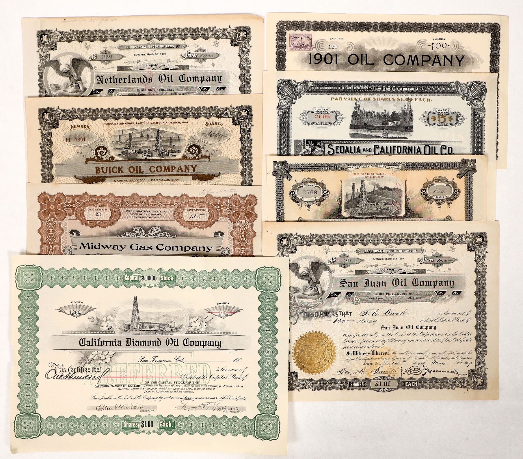 A group of 8 stock certificates from eight California-based oil companies, dating from 1901 to 1916. All certificates in the lot are issued; two have been cancelled using handwritten cancellations. See photos for names of all companies in the lot. Four certificates have interesting vignettes of oil derricks/oil fields. Generally good condition, though several certificates have wear at the edges/toning.
