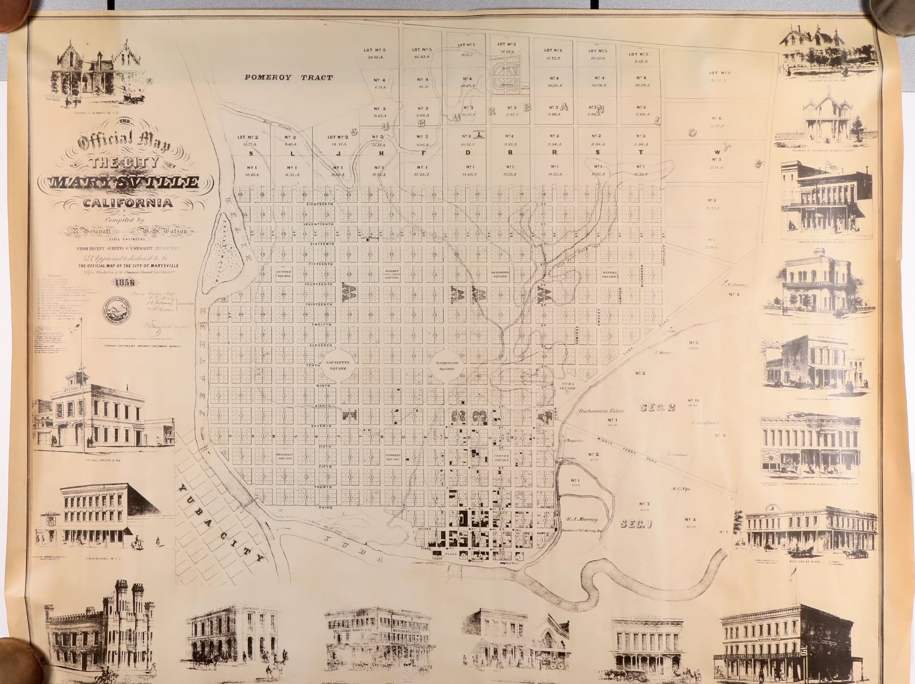 2 copies of old California maps. Birds eye view of Chico 30x41". Marysville 1856 42x54". California