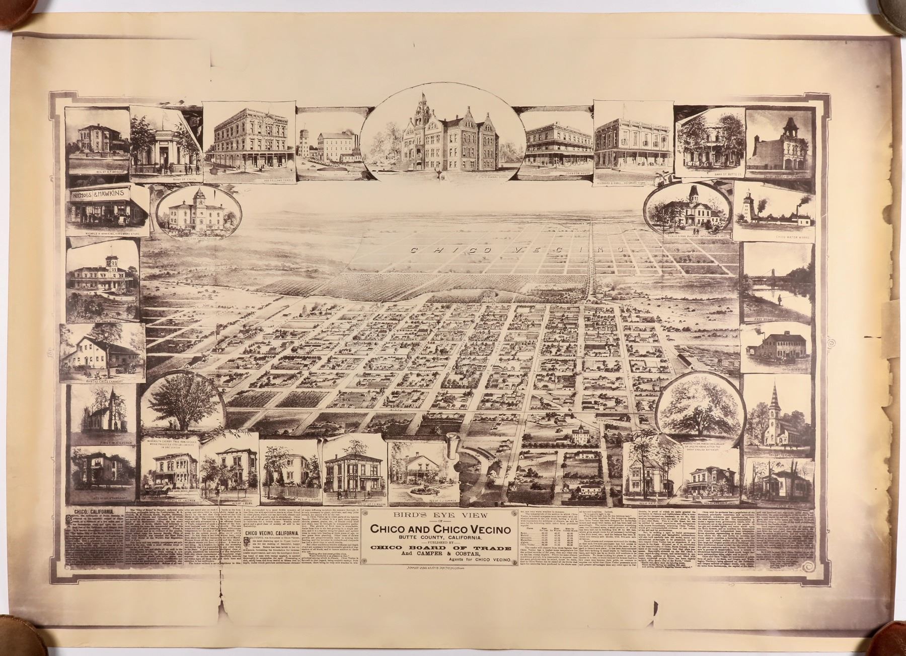 2 copies of old California maps. Birds eye view of Chico 30x41". Marysville 1856 42x54". California California