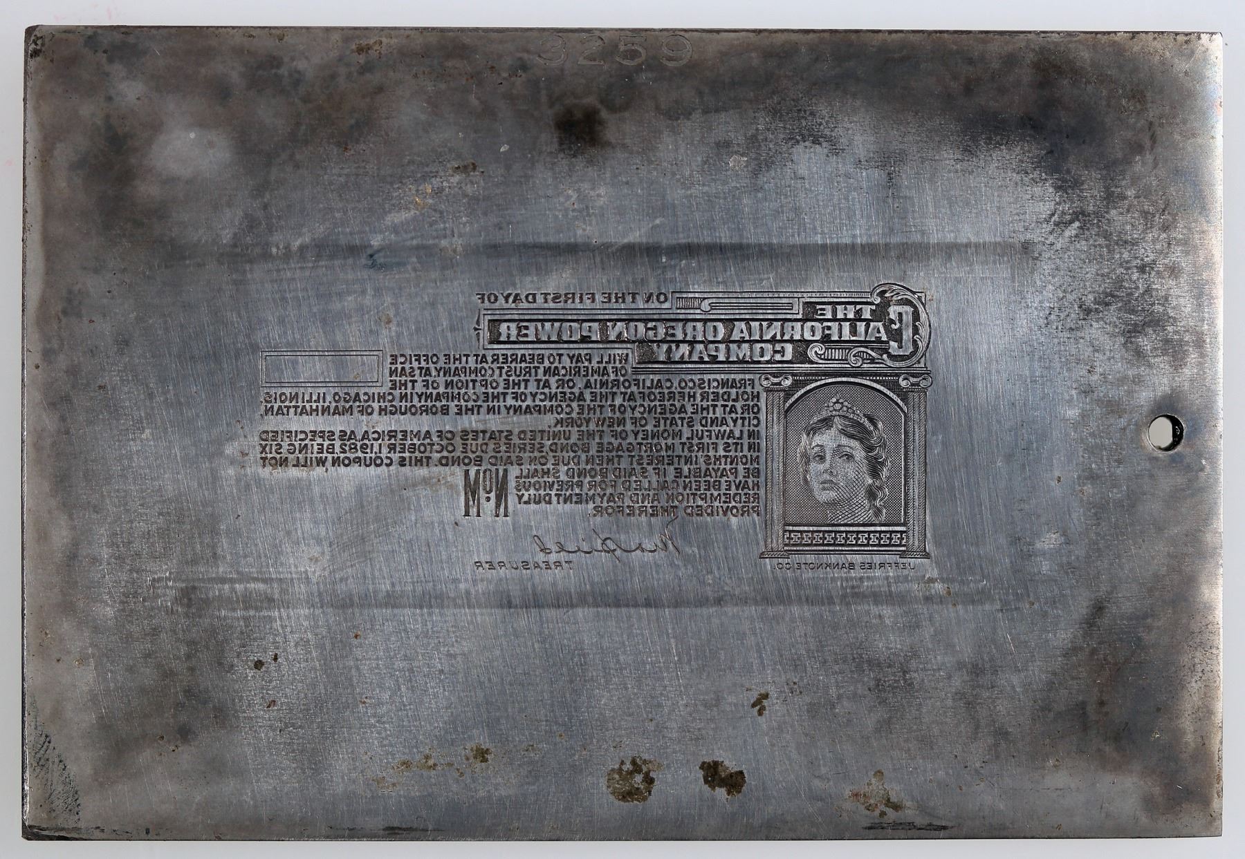 Steel printers plate for a bond coupon for The California Oregon Power Company. Plate made by Jeffries Banknote Company. No denomination. Redeemable at San Francisco, Chicago, and Manhattan. Bond due in 1982. Vignette of a queen/princess. Signed by the treasurer. Identifying number at top is 3259. Plate is 3 x 4.5" Operated Northern California and Southern Oregon, the California Oregon Power Company was better known as COPCO. It later merged into Pacific Power and Light Company and is now part of PacifiCorp.