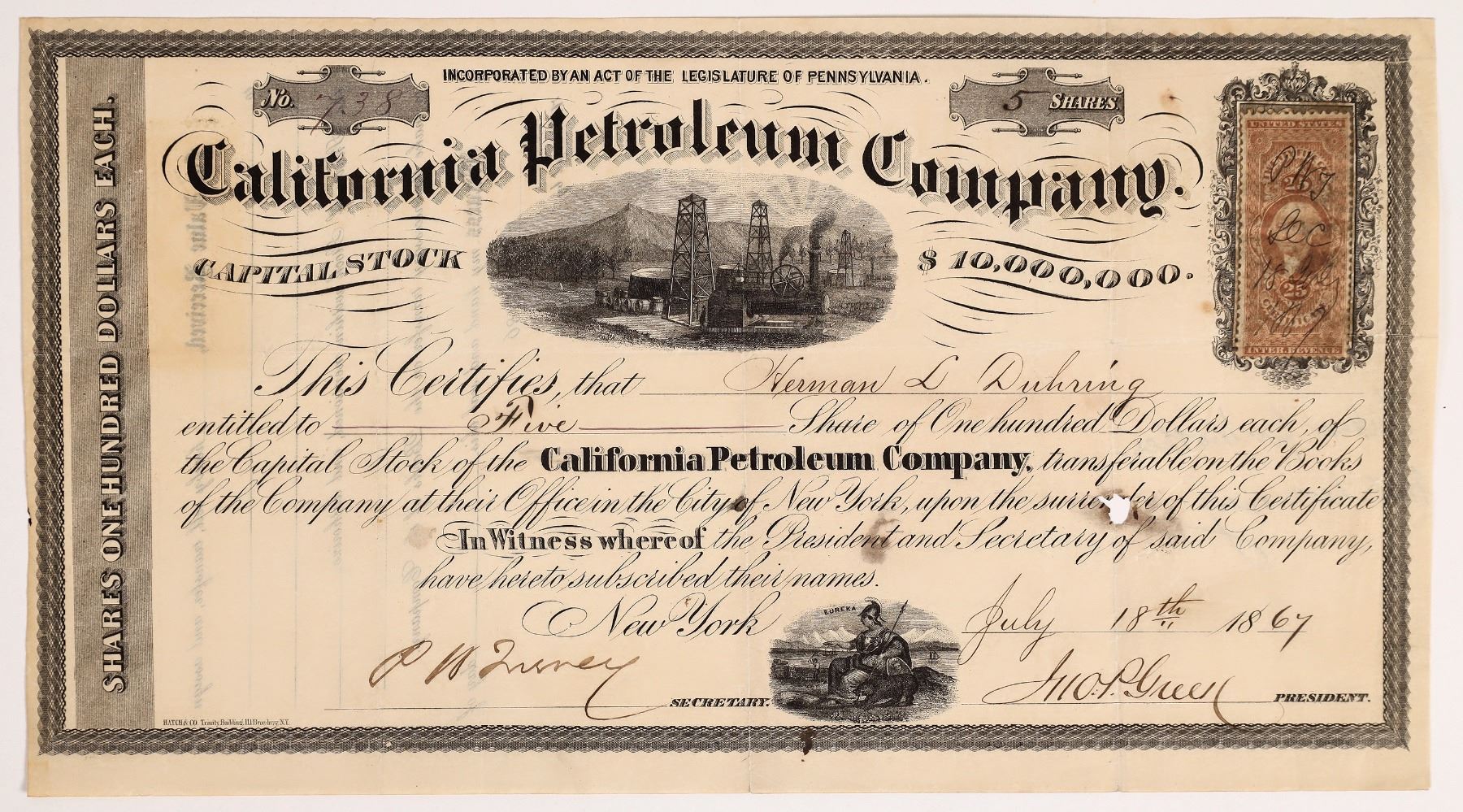 This is stock no. 738. Issued for 5 shares to Herman L. Duhring in New York in July 1867. Signed by president John P. Green and secretary PH Turey. Not cancelled. Black border and print with two vignettes: oil field with derricks (top center) and California state seal (bottom center). Printed by Hatch & Co., NY. 25 cent US IR stamp attached at upper right. Folds, hole in stock, small tears and discoloration. 6 x 11" John P. Green served during the Civil War as a captain of the Union Army with a volunteer association of riflemen headed by General Thomas L. Kane. After the war, Green began working as a secretary for the Pennsylvania Railroad. He eventually worked his way up to the position of vice president in 1907.