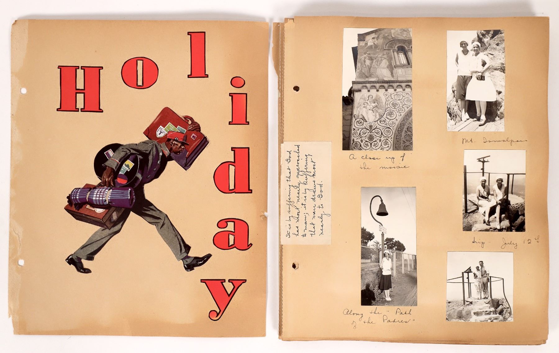 Unbound c. 1930's California photo holiday album with about 80 small photos. Santa Cruz big trees, Yosemite, Mission San Juan, race track, La Joya, Santa Barbara etc. Nice group!