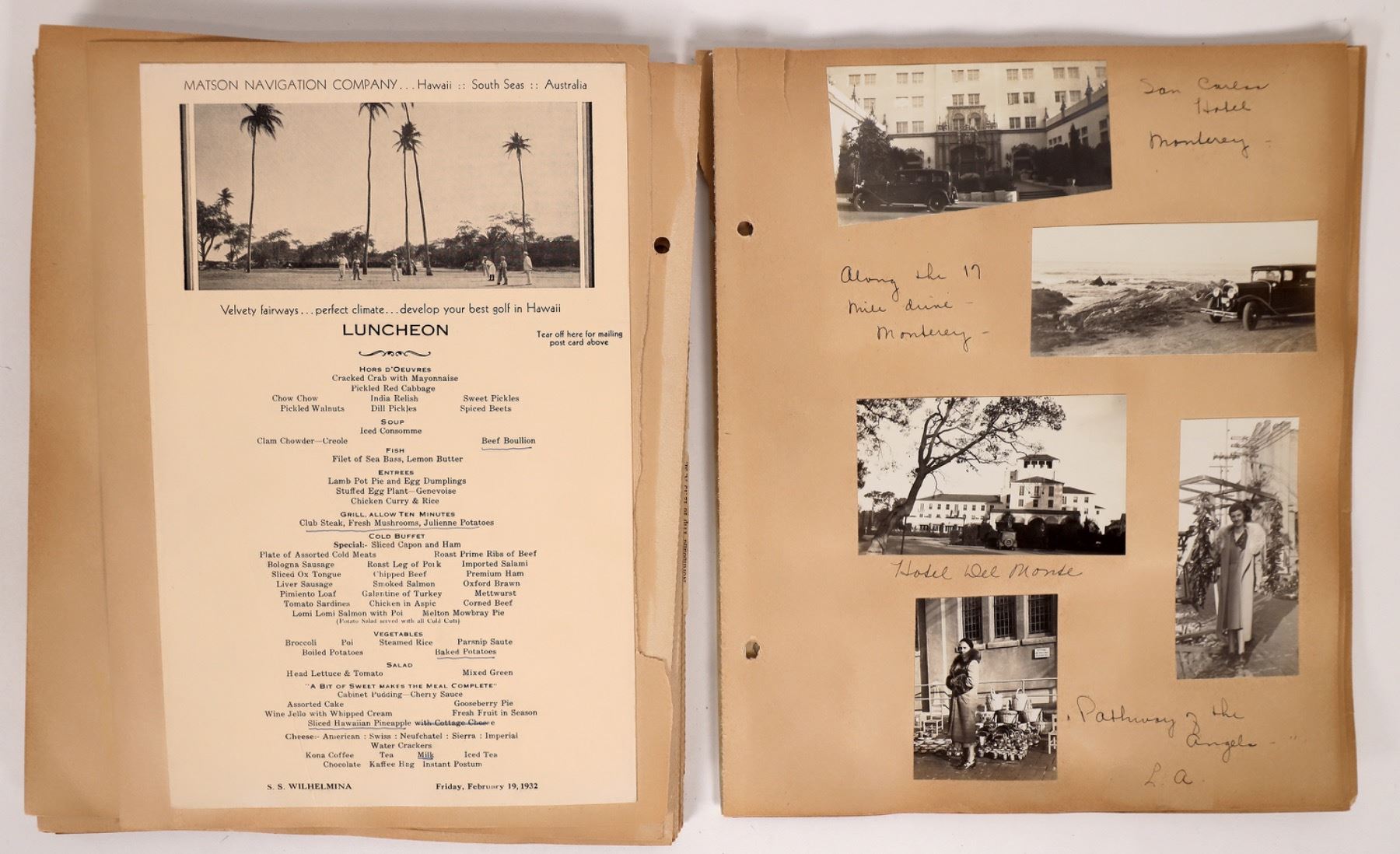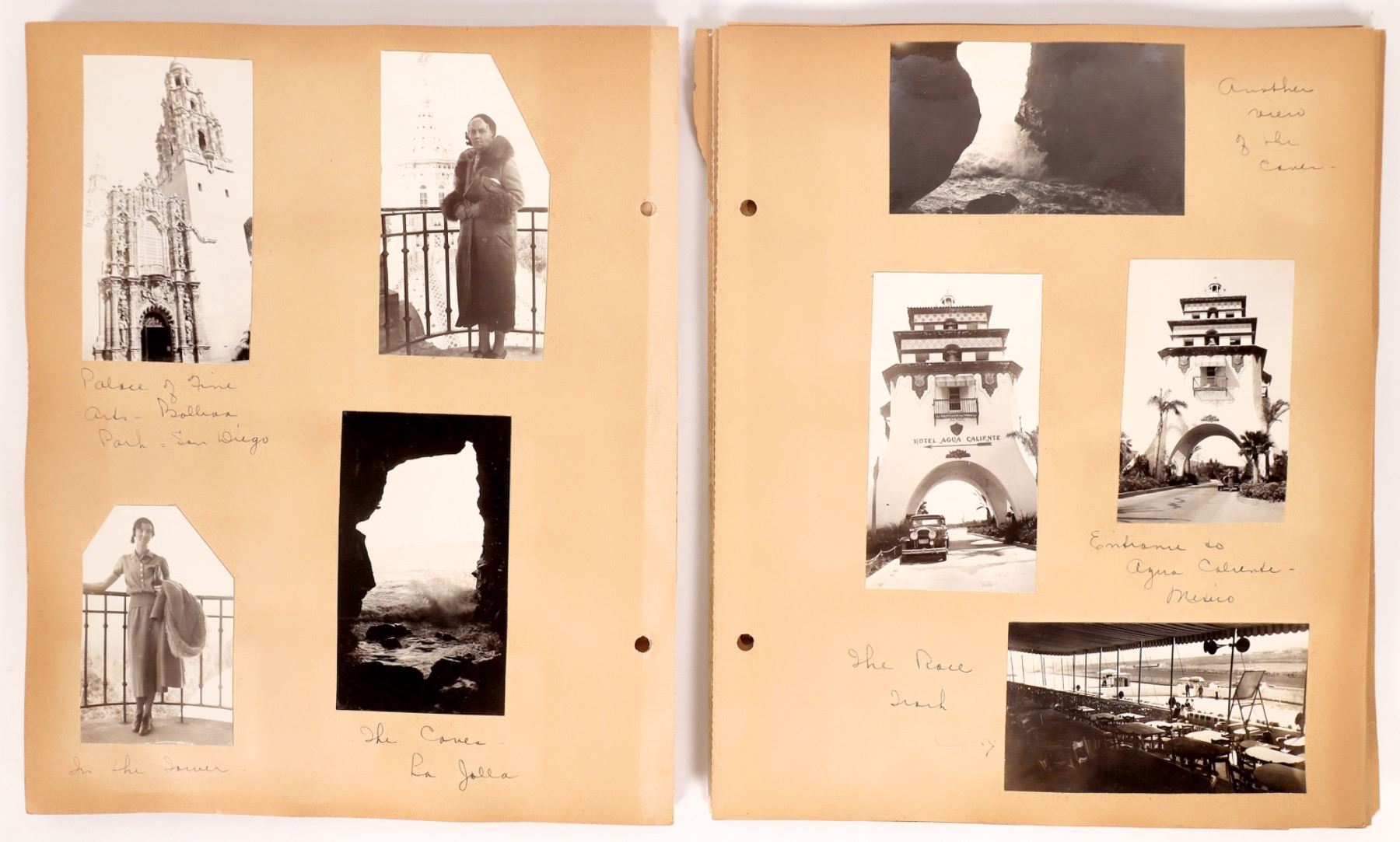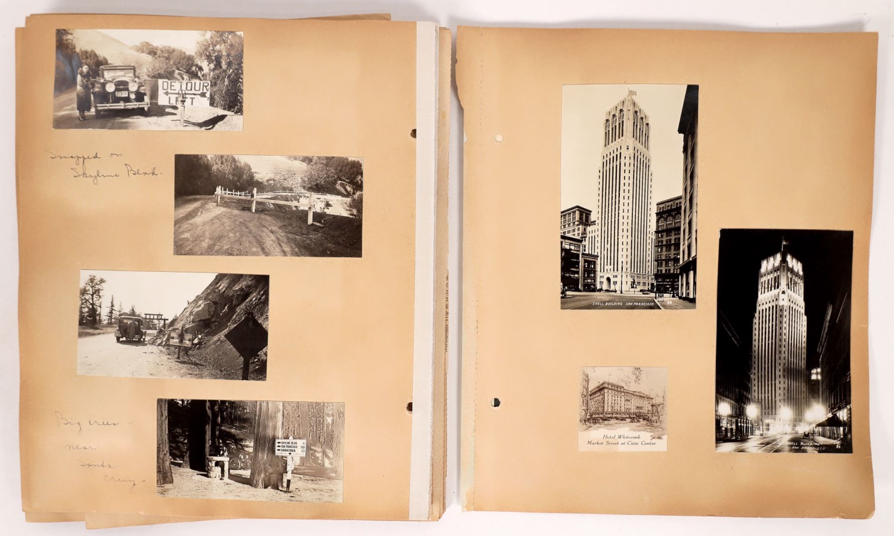Unbound c. 1930's California photo holiday album with about 80 small photos. Santa Cruz big trees, Yosemite, Mission San Juan, race track, La Joya, Santa Barbara etc. Nice group! California Ken Prag Collection