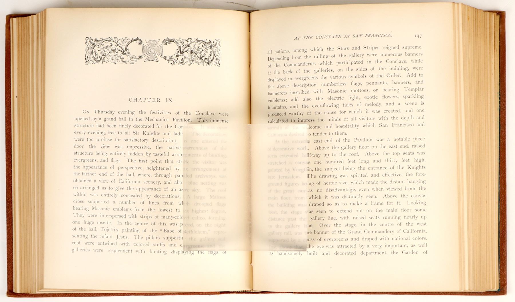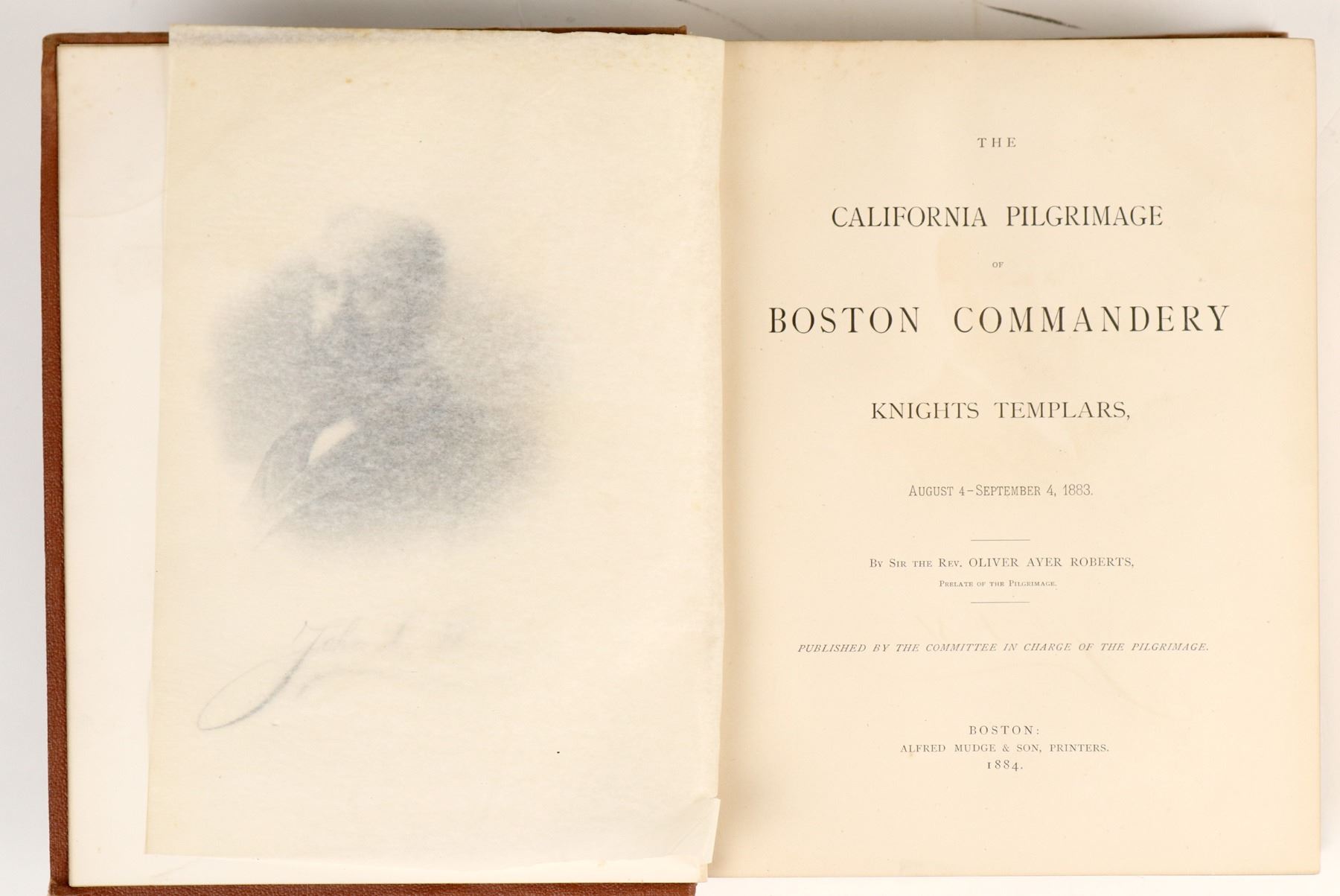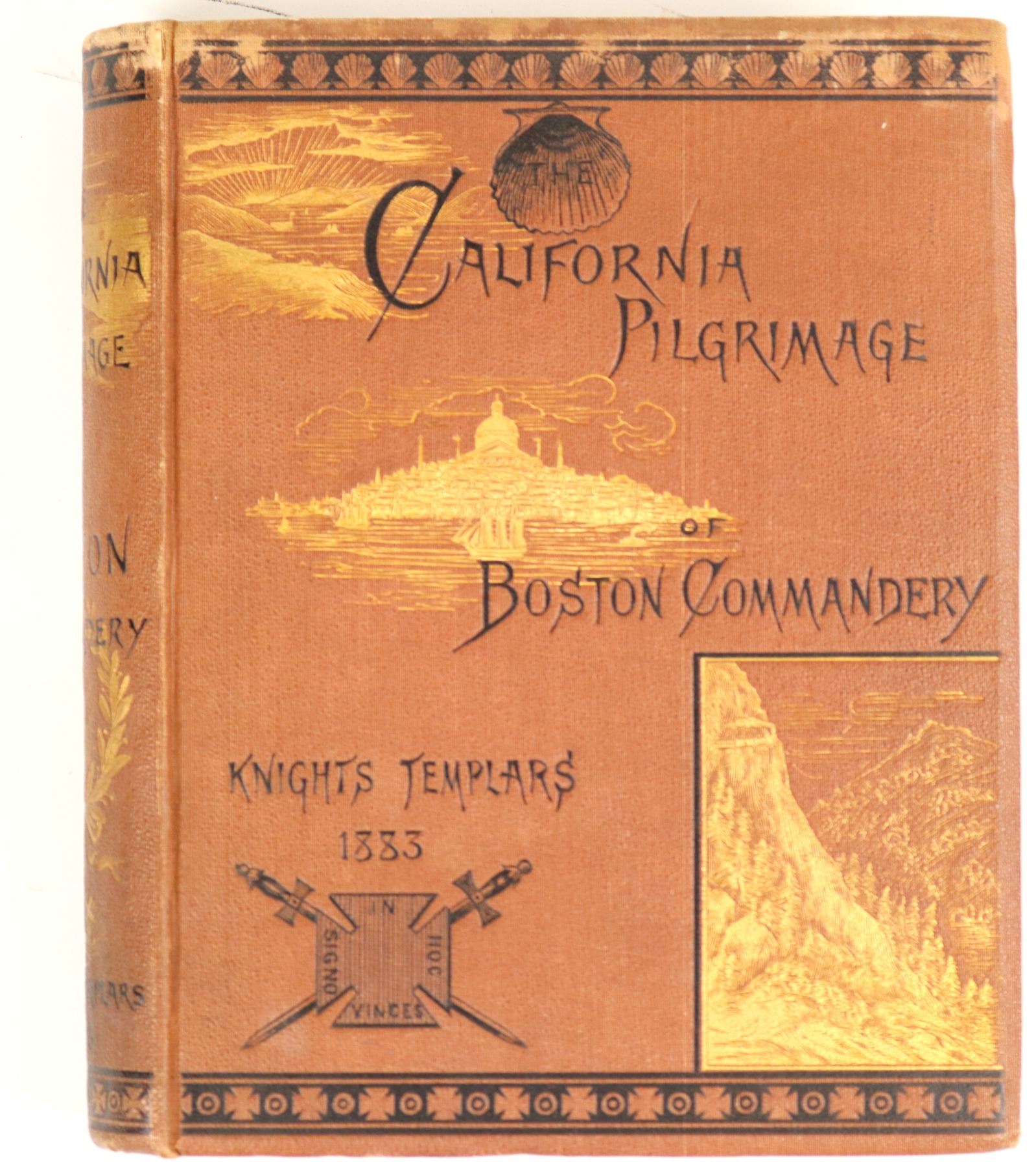 401pp with attractive gilt cover and spine. Full page map, 2 steel engravings with many illustrations. Tales of a Knights Templar journey from Boston to California and back. Good insight into late 19th century travel. Spine and boards have edge wear.