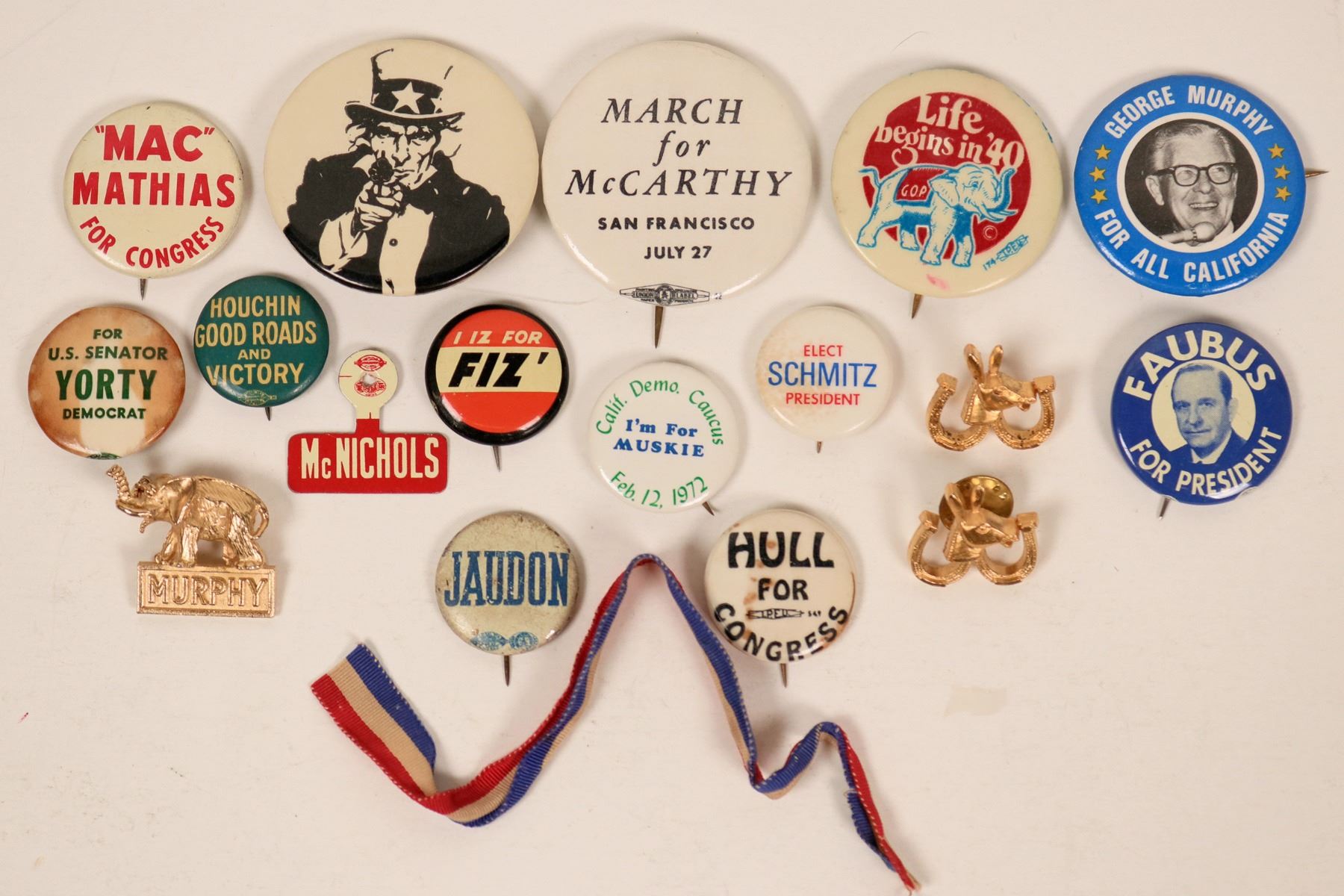 These are 16 pin backs mostly touting California politics. Buttons feature George Murphy, Sam Yorty, Eugene McCarthy, Mac Mathias and others. All are in good condition. See photos for more details.