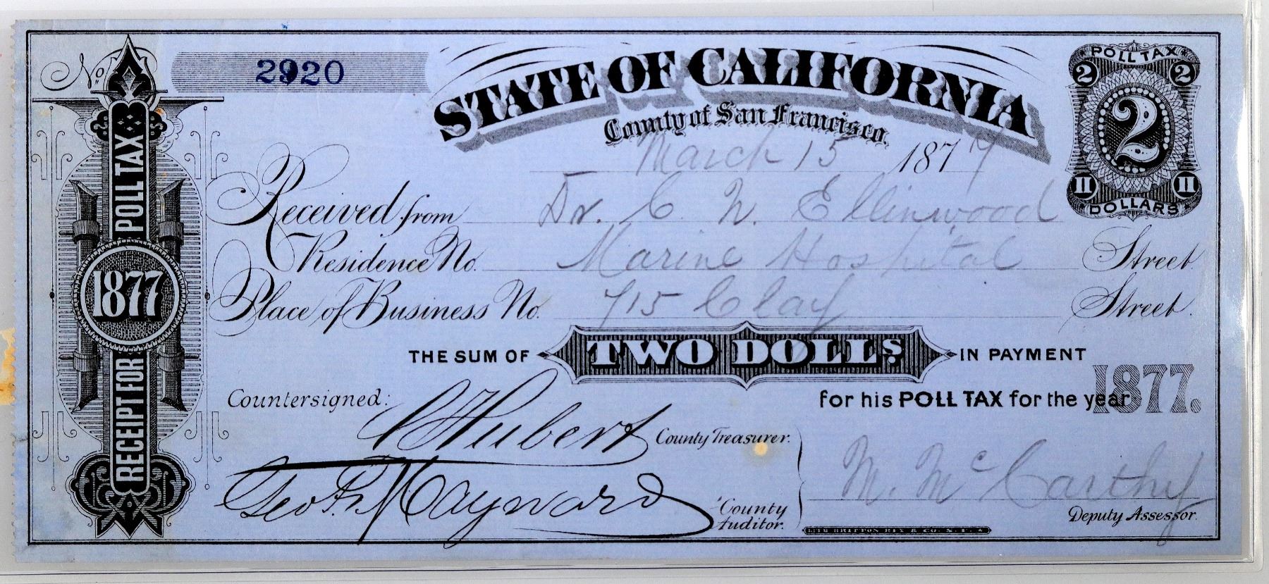 2920 issued March 1877 to Dr. C. Ellingwood of the US Marine Hospital, San Francisco County. Signed by Deputy Assessor M. McCarthy. $2 Poll Tax facsimile adhesive stamp in upper right. Black on blue paper. Lith. Britton, Rey & Co., SF. 3.25 x 7.5" Mahler calls these receipts "exceedingly rare." He argues that these were only indirectly related to voting and more used as a "head tax" on adult males. He has seen only 32 examples of these receipts. For more information, please see "California Poll Tax Receipts" by Michael Mahler, The American Revenuer, Vol. 65, No. 2.