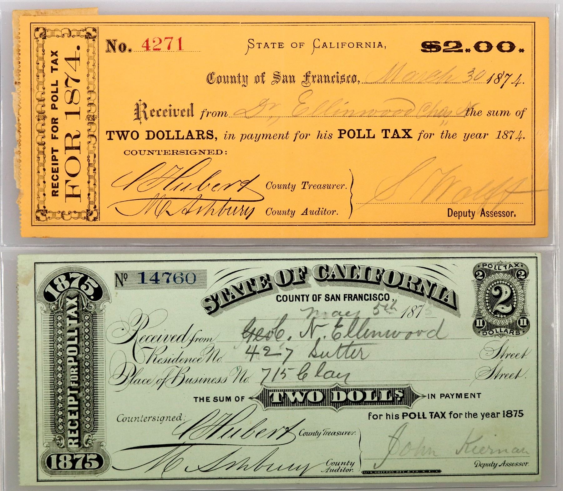 Lot of 2 different. 1) Receipt for Poll Tax 1874, County of San Francisco, March 1874. Issued to Dr. Ellinwood. Signed by the Deputy Assessor. Black on yellow paper. This receipt does not have the stamp facsimile seen on the other poll receipts. 2) Receipt for Poll Tax 1875, issued May 1875 to C. Ellinwood living at 427 Sutter. Signed by Deputy Assessor John Kiernan. $2 facsimile stamp in upper right corner. Black on green paper. Lith. Britton, Rey, & Co. 3.25 x 7.5" Mahler calls these receipts "exceedingly rare." He argues that these were only indirectly related to voting and more used as a "head tax" on adult males. He has seen only 32 examples of these receipts. For more information, please see "California Poll Tax Receipts" by Michael Mahler, The American Revenuer, Vol. 65, No. 2.