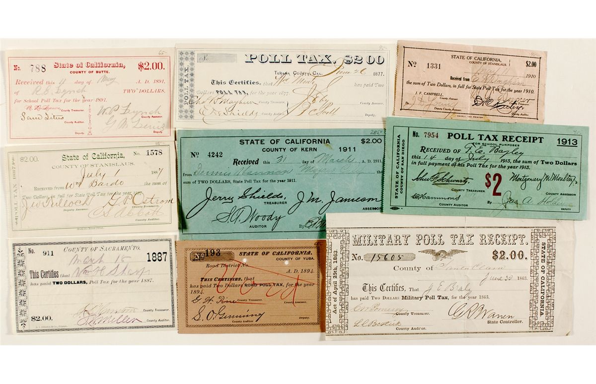 Lot of 9. 1) Military Poll Tax Receipt. Santa Clara County. 1863. 2) Poll Tax receipt from Sacramento, 1887. 3) School Poll Tax receipt for Butte County, 1891. 4) Poll Tax for Tehama County, 1877. 5) Two State Poll Tax Receipts for Stanislaus County (1887 and 1910). 6) Road Poll Tax receipt for Yuba County, 1894. 7) State Poll Tax for Kern County, 1911. 8) School Poll Tax Receipt for San Diego County, 1913. Prag Collection