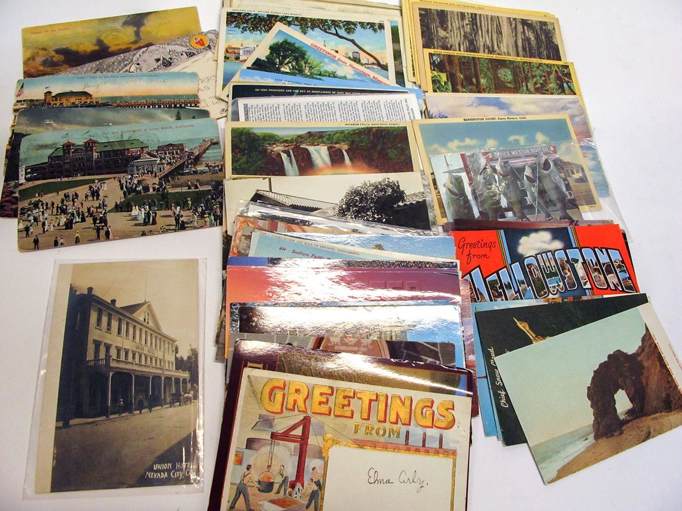 60+ California postcards, RPC, color and chromolitho. The highlight is an RPC of Union Hotel in Nevada City. Golden Gate Bridge, redwoods, Rose Parade, Sacramento and more. Date: Location: California HWAC# 571461