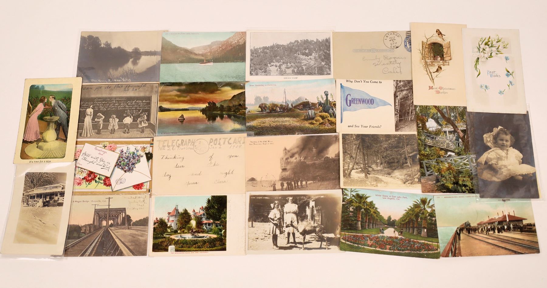 Lot of 22 with 5 RPC's. Postmarks include Dolgeville, Purser, Olancha, Parlier, Greenwood, Melburne, Pacheco, Lathrop, Ioamosa, Skyland Heights, Mayhew, Stubbs, Salida Beach, etc. Three RPO's. Find railroad bridges and depots, Winchester House, Seeley Camp, Pitt River, lakes, Cliff House on fire, ice cream shop buried in the snow, etc. Many greetings cards.
