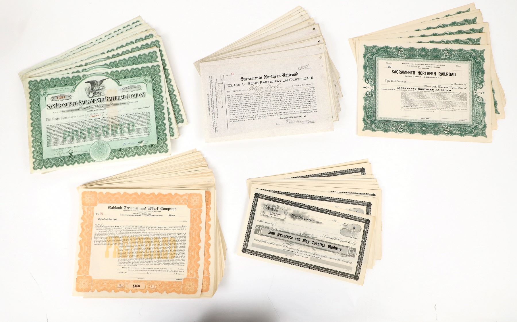 Over 200+. I/C, U/U, I/C. Issued 1908-20. Fine or better. Included :1. San Francisco-Sacramento Railroad Co., some have revenue stamps. 2. San Francisco and Bay Counties Railway Co. U/U/ 3. Sacramento Northern Railroad, two varieties. 4. Oakland Terminal and Wharf Co. U/U, two varieties.