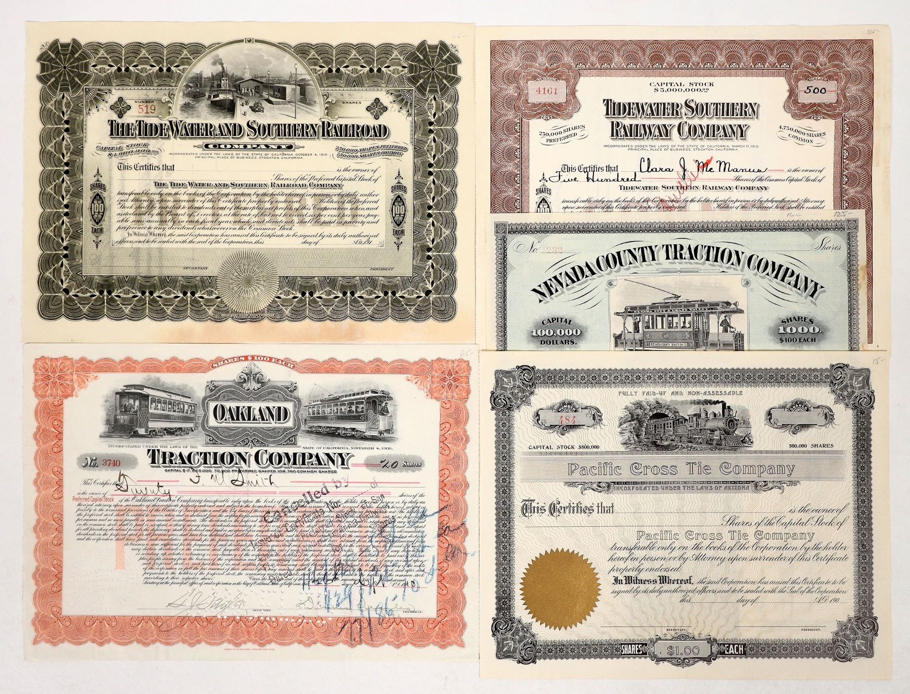 Issued-1915 Tidewater Southern Railway, 1910 Oakland Traction. Unissued-Tidewater and Southern, Nevada County Traction-right side stains, Pacific Cross Tie, Oakland Terminal and Wharf.