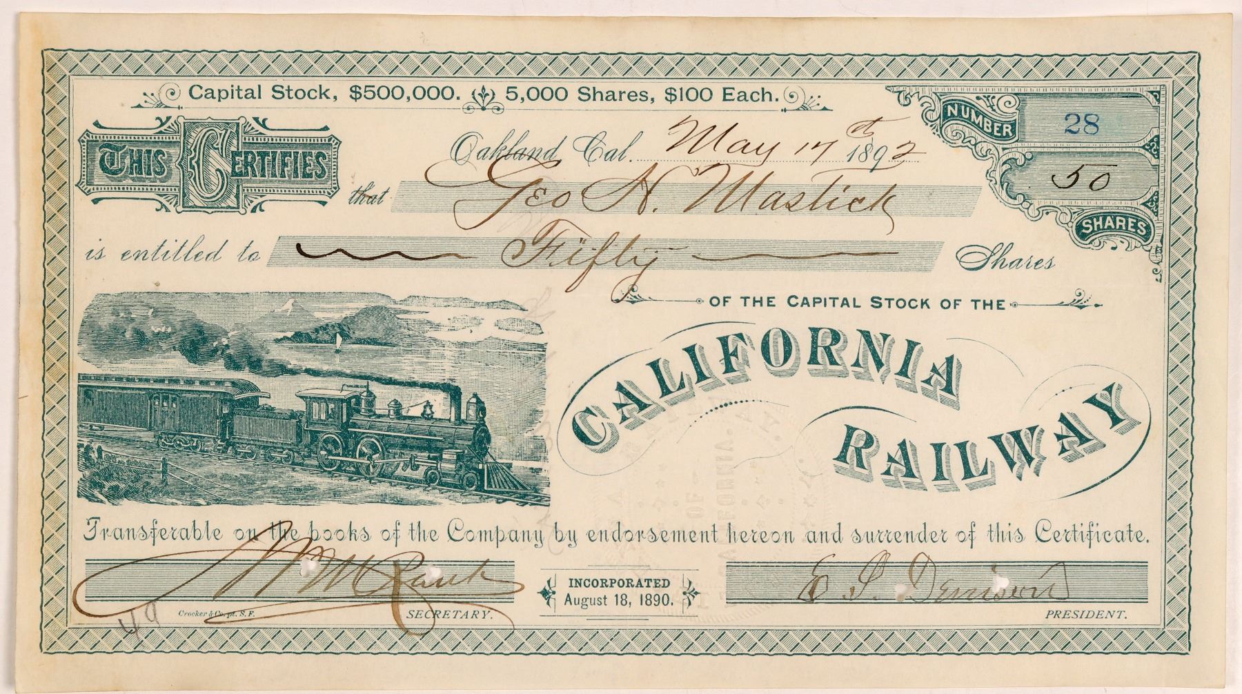 California Railway stock cert from Oakland, dated May 17, 1892. I/C No. 28, for 50 shares to George H. Mastick, signed by President E.P.(?) Dennison.