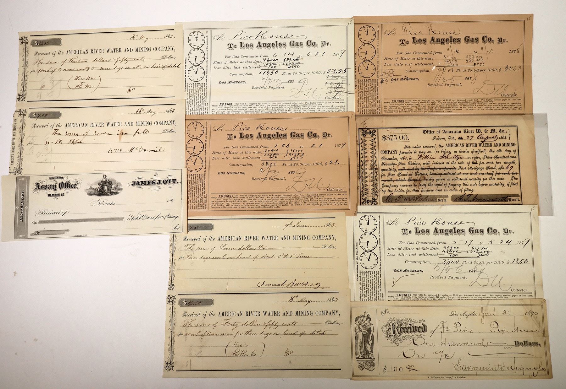 Lot of 10 receipts from business in CA plus one from Nevada. Collection consists of 5 receipts issued by the American River Water and Mining Company/Folsom, 4 dated 1863, the other 1862. There are also 4 receipts from the Los Angeles Gas Co for metered gas payments dated 1878 - 1879, one receipt for monies received from the Pico House, Los Angeles dated 1879, and a blank/unused receipt from James J. Ott of the Nevada Assay Office w/date mark 186__. Most impressive item is likely the 1862 American River W & M Co receipt with states that the company promises to pay William Schultze $375 with interest with a $500 First Mortgage Bond held as collateral security for this note. City: State:California Date: