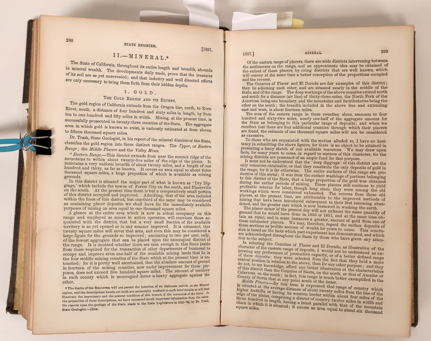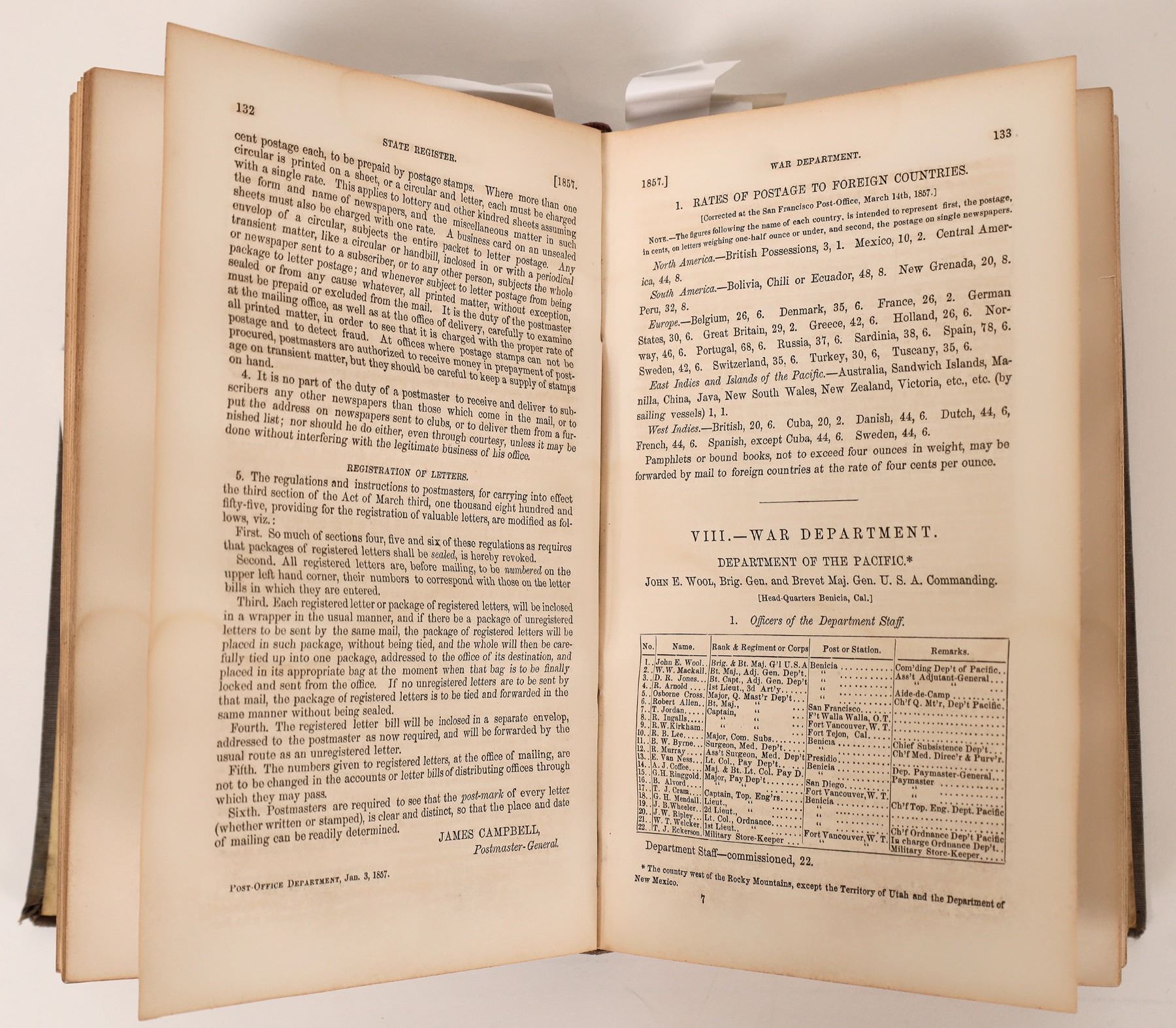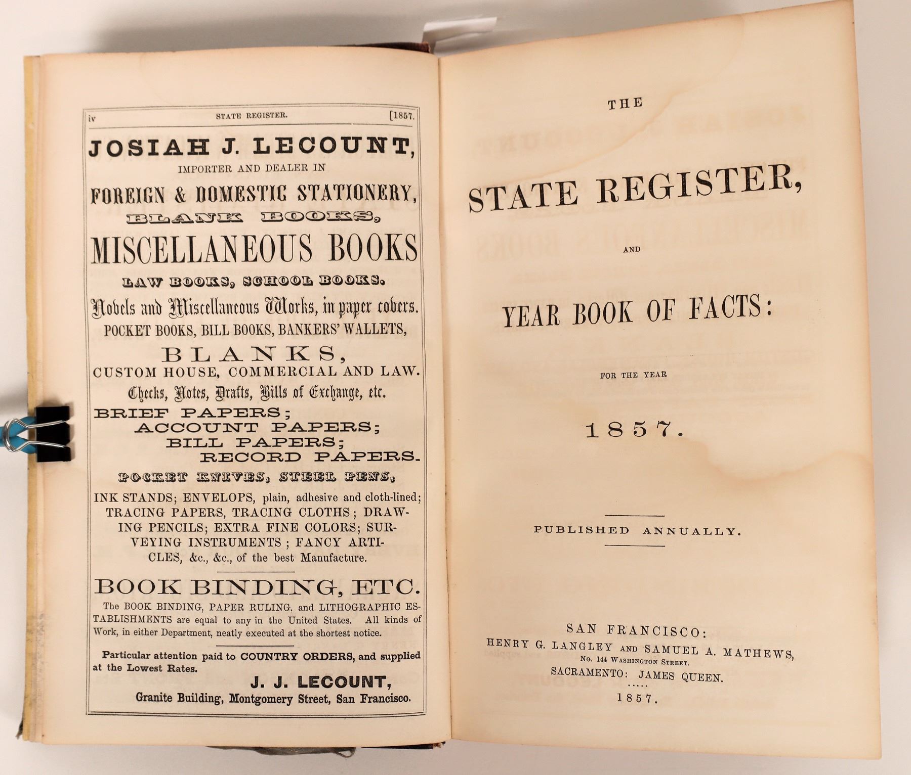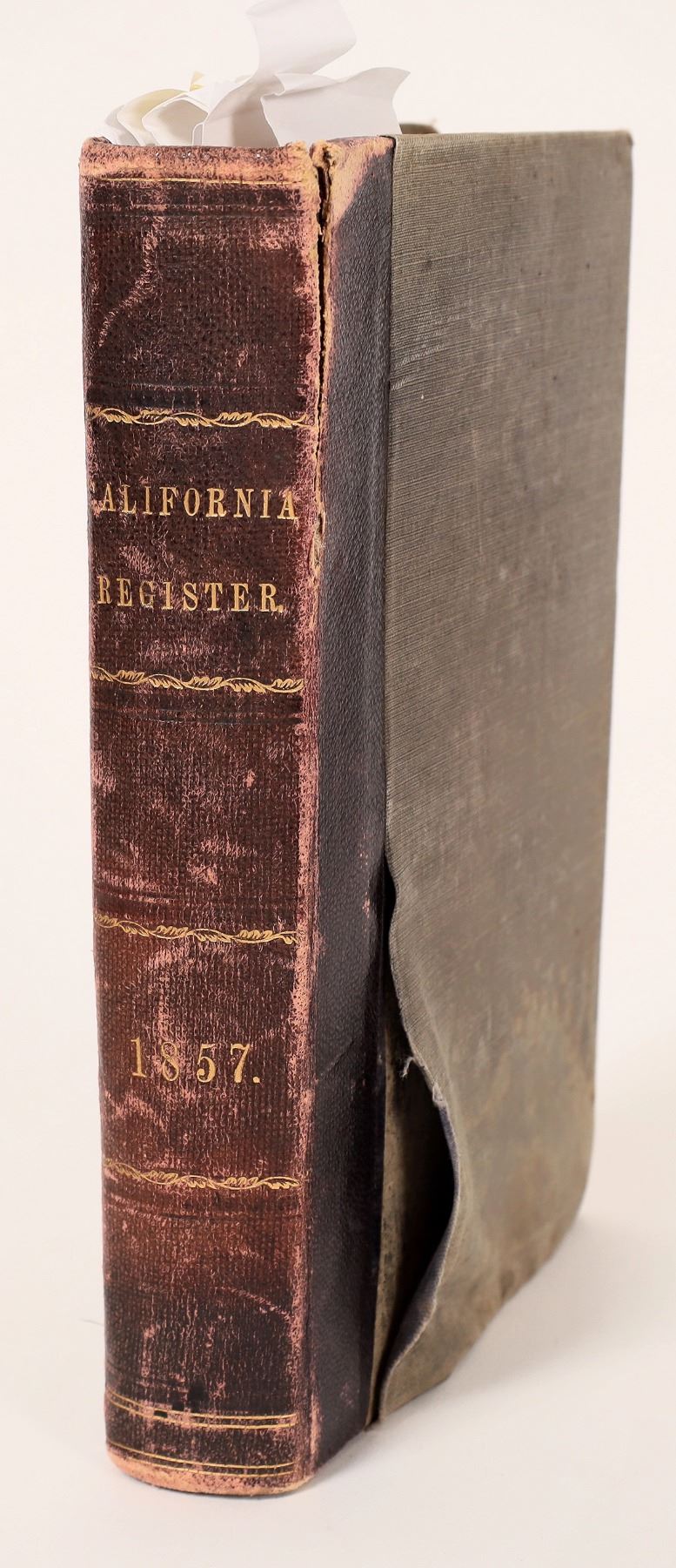 California State Register and Yearbook of Facts, 1857 Henry G. Langley and Samual A. Mathews in San Francisco and James Queen in Sacramento.1857 viii, 384 pp. (including ads). 7½x4½, original leather-backed cloth, spine lettered in gilt. The California State Register and Year-Book of Facts for the year 1857. Published Annually. Part I - Calendar and celestial Phenomena; Part II - United States and the Officers thereof (includes details of the Branch Mint in San Francisco); Part III - California and the Officers thereof; Part IV - Statistics, Etc.; Part V - Resources of the State, Section 2 of which covers Minerals, types of Gold Mining and has a table of Quartz Mills listed by county. Section 5 has a description and table of the Canal and Ditch Companies that comprise some 4,405 miles established for mining purposes. Part - VI - Counties of the State and the organization thereof. “The plan of this work, which has been carried out with singular fidelity in this first volume, is to furnish statistics, full and reliable, concerning each branch of the resources of the State, and a complete exhibit of the finances thereof, including the different county and municipal organizations, carefully prepared and arranged, from information through official and other reliable sources. It contains nearly as much matter as the "American Almanac", and as a State work, will not sutler by comparison with that useful book of reference. The commercial, civil, and other relations of California with all our large cities cannot fail of securing for it a circulation beyond its locality. We regret that our limited space prevents us from giving even an outline of the table of contents. We commend it with confidence to all who would be well informed in regard to the "Golden State." A valuable collection of data on California’s government, business, climate, agriculture, and even earthquakes. The long (p.27-36) earthquake report by Lorenzo Hubbard M.D. concludes by warning, “Had the shock been as severe at San Francisco as at Fort Tejon [a recent quake], the whole city would have been in ruins, and thousands of lives sacrificed in the general crash.” A description of the California Metallurgical Works operated by Messrs. Uznay and Haraszthy & Co. on p.251. First year of publication for this short-lived annual; the only other year was 1859. Cowan p.620; Greenwood 882. Some staining to covers, most notably the lower portion of the front, front joint starting to split at top; light to moderate damp staining within, about very good San Francisco California Franklin Collection