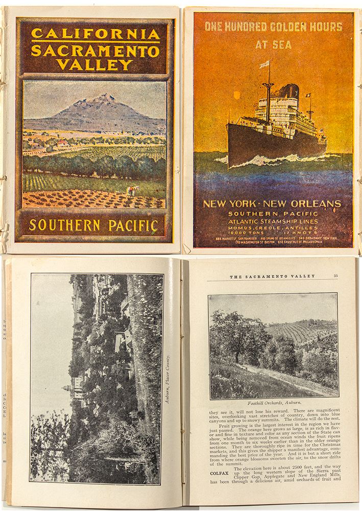 Booklet by A. J. Wells titled" The Sacramento Valley of California" published by Southern Pacific Railroad Company, 1980. The booklet (6.5" x 4.5") includes photos and train routes and descriptions of opportunities, climate, farming and agriculture, descriptions of various cities.