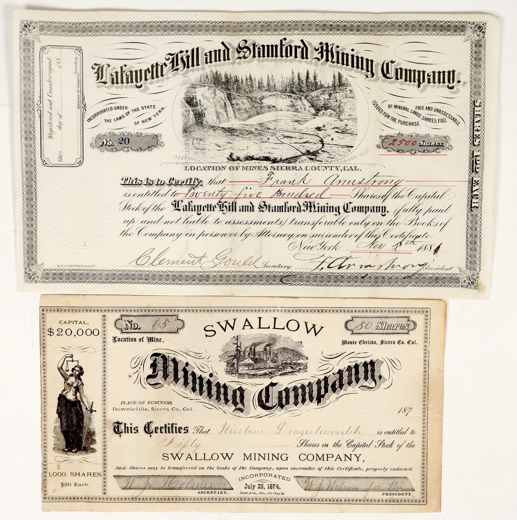 Lot of 2. I/U. 1. Swallow Mining Co. Cert.. #65, issued for 50 shares to Nicolaus Draestinovitch. Signed by W.J. Holmes, the corporate secretary. I/U but undated, dateline 187_. The co. was incorporated in 1874, and with this low certificate number, Location of mine: Monte Christo, Sierra Co., Cal. at top right. Place of business, Downieville, Sierra Co., Cal. at left. This firm only had a total capital of $20,000 with 1000 shares authorized at $20 each. So, our 50 shares were 5% of the float. Monte Christo was located about 3 mi. north of Downieville, near Poker Flat. An internet search showed a Swallow mine was located there. The diggings were on the main Blue Lead, with extensive drift mining as early as 1852 (Gudde, California Gold Camps). Nice millsite vignette and an allegorical female holding a scale and sword at left. Uncancelled. City: Downieville State: California 2. Lafayette Hill And Stamford Mining Co. Sierra County, California¶... (Inc. in New York), 1886. 2500 Shares, I/U, Capital Stock Certificate, Black printing with men hydraulic mining on side of cliff at top, Low serial number 20, VF-XF condition.