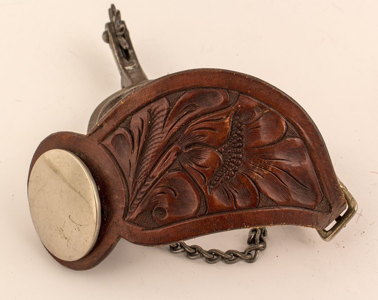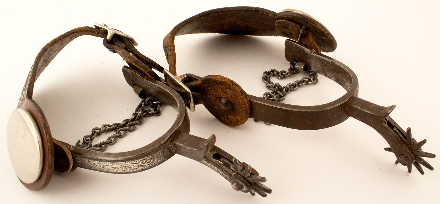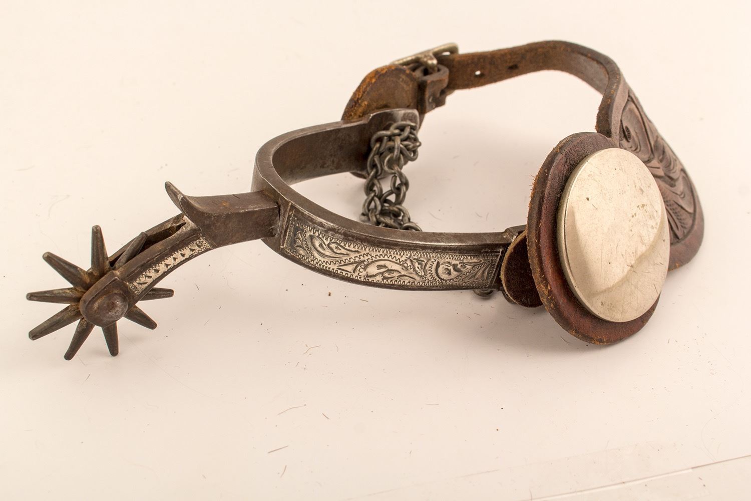 Silver InLaid Spurs with Heel Chains and Straps with Conchos. Consigned by The Cowboy Connection in Livingston, MT. State: City: Date: ID# 49834