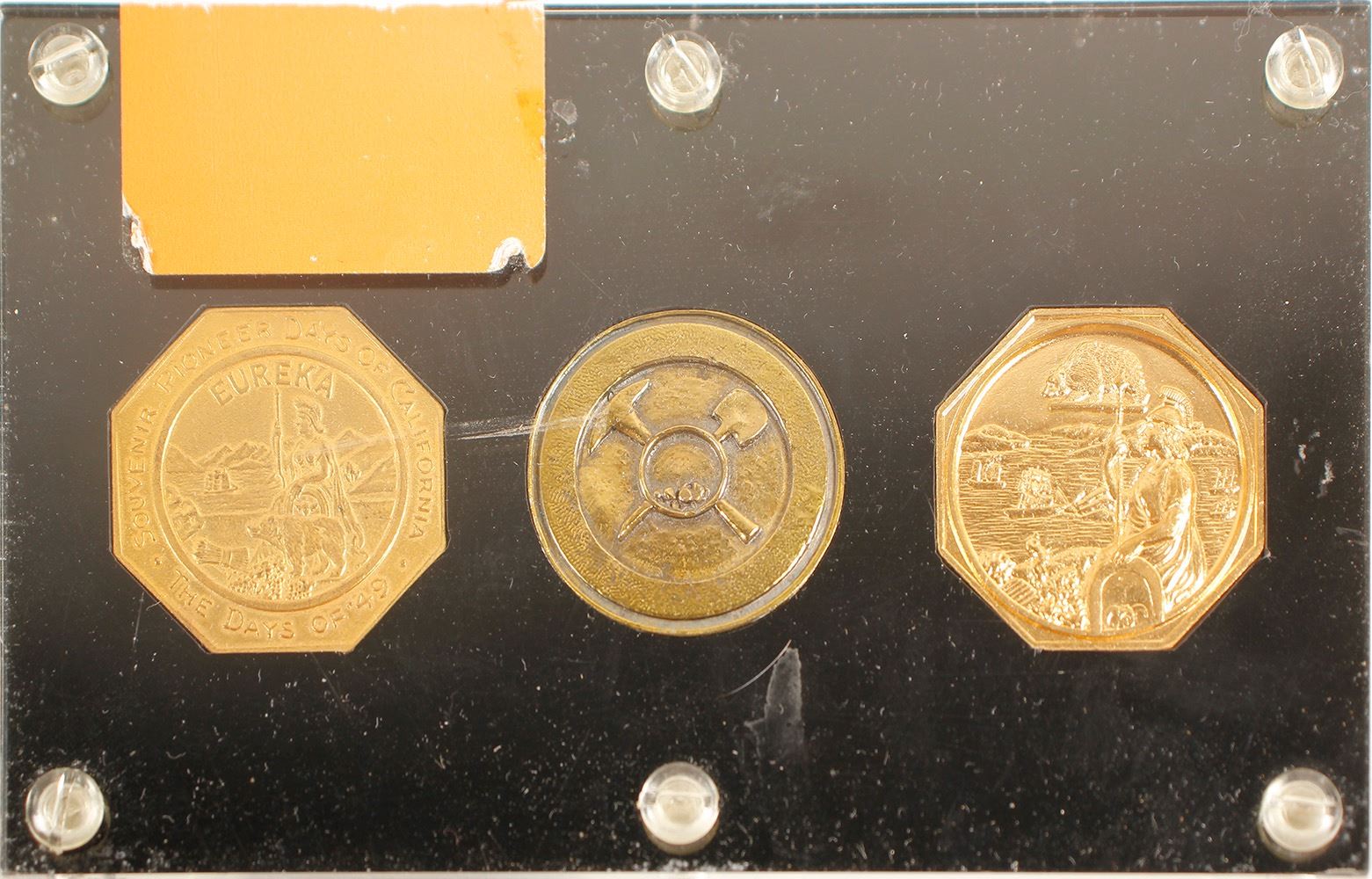 HK 497, gem uncirculated, 1948 Cal Gold Discovery centennial,; Calif gold Rush Centennial, 1949 HK 500 or 501 (reverse looks gold plated), uncirc; Pioneer Days of Cal, Days of 49, apparently not listed, uncirc. Encased in Plastic holder, "California Centennial Celebrations" HWAC# 62937 Date: Location: California