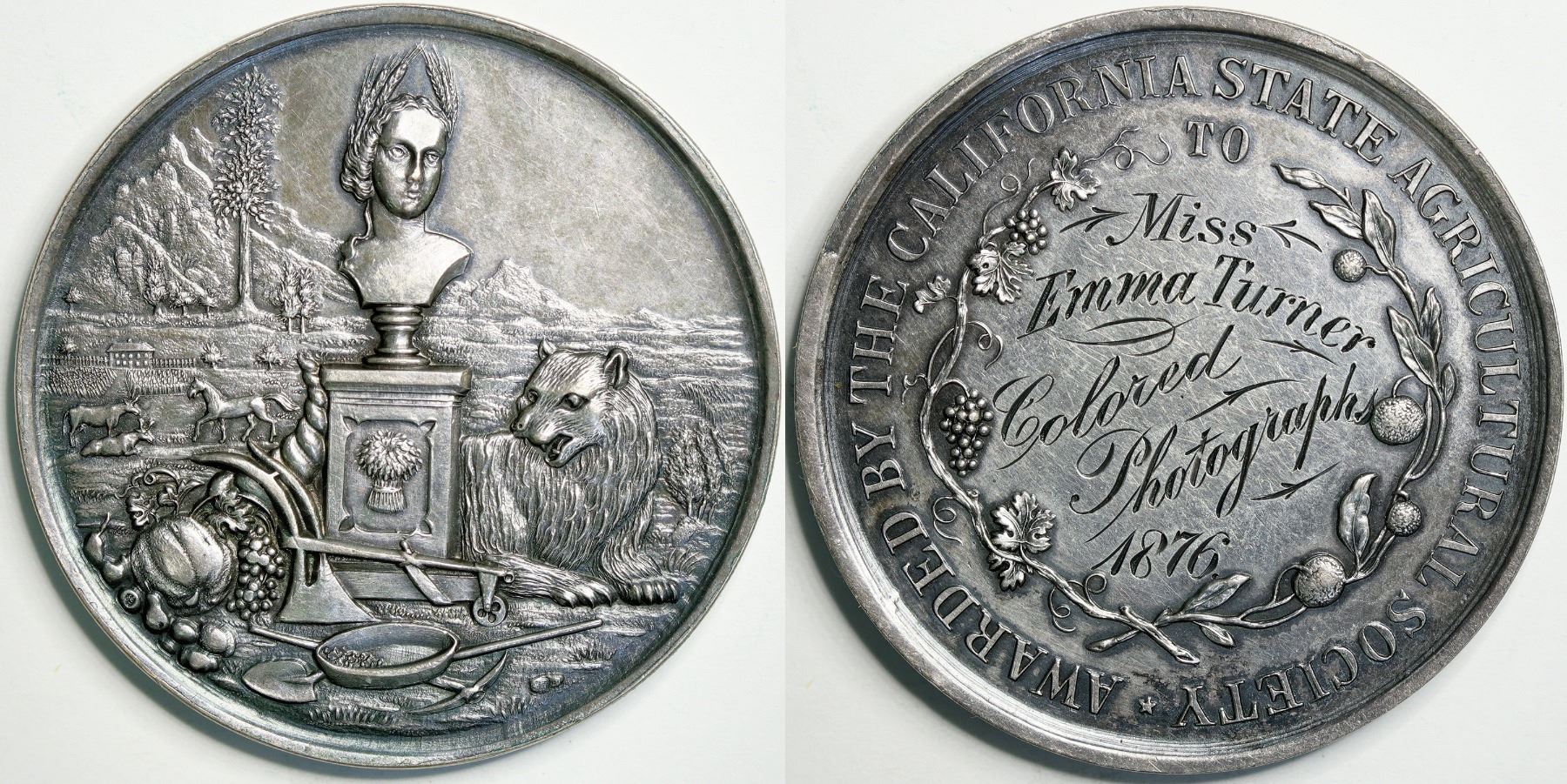 California State Agricultural Association large size silver award medal. Complex obverse design composed of images relating to California commerce, agriculture, and mining with a bust of Ceres on the central pedestal with the California bear at its base. Reverse engraved to San Francisco artist Emma Turner for Color Photography 1876. 44.6mm. Silver. Toned Unc