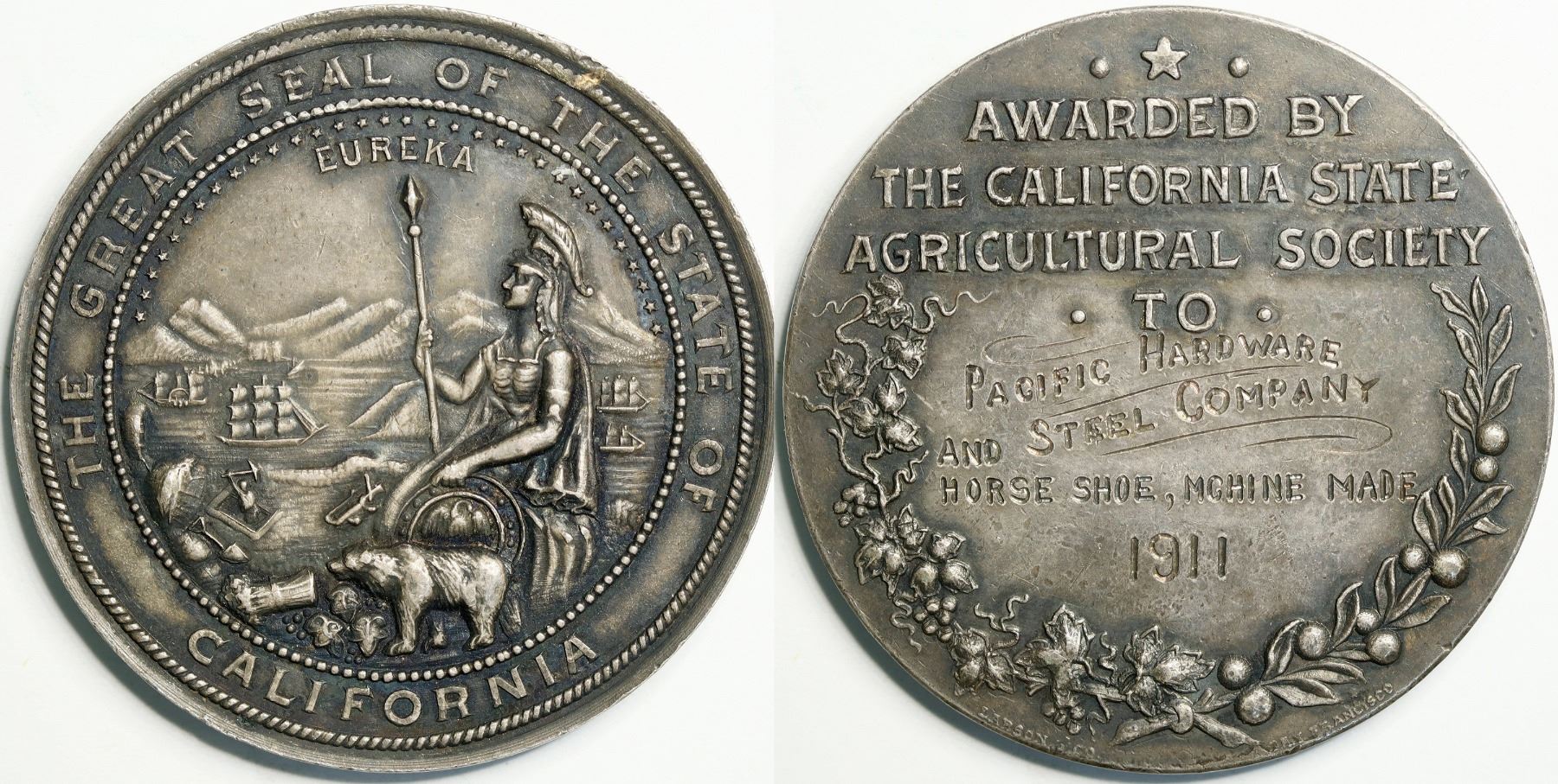 California State Agricultural Society Silver Award medal. 1911 Larson & Co. die awarded in 1911 to Pacific Hardware and Steel Company for Horse Shoe, Mchine [sic.] Made 1911. 45.24mm. Silver toned.