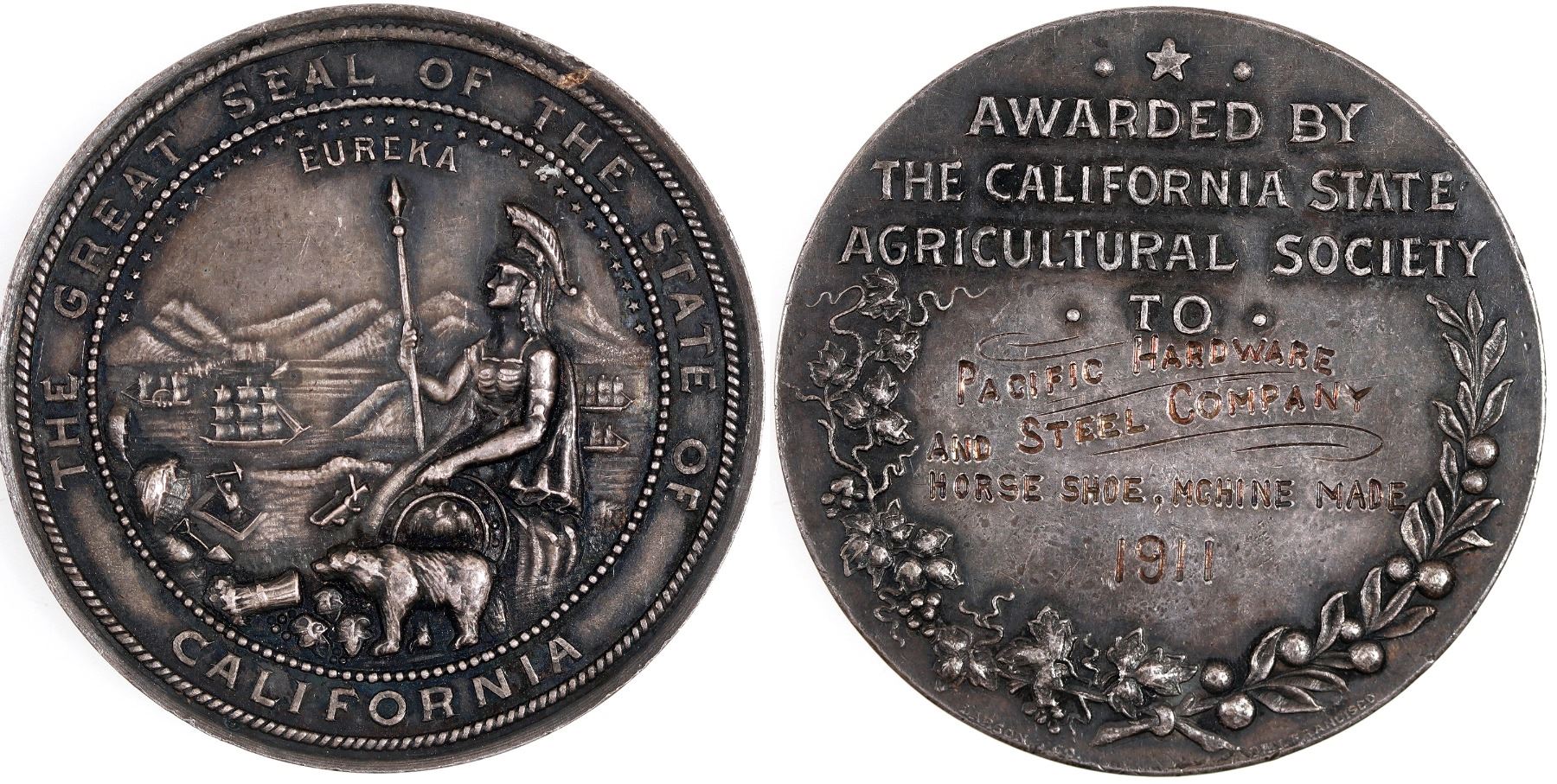 California State Agricultural Society Silver Award medal. 1911 Larson & Co. die awarded in 1911 to Pacific Hardware and Steel Company for Horse Shoe, Mchine [sic.] Made 1911. 45.24mm. Silver toned. Sacramento California
