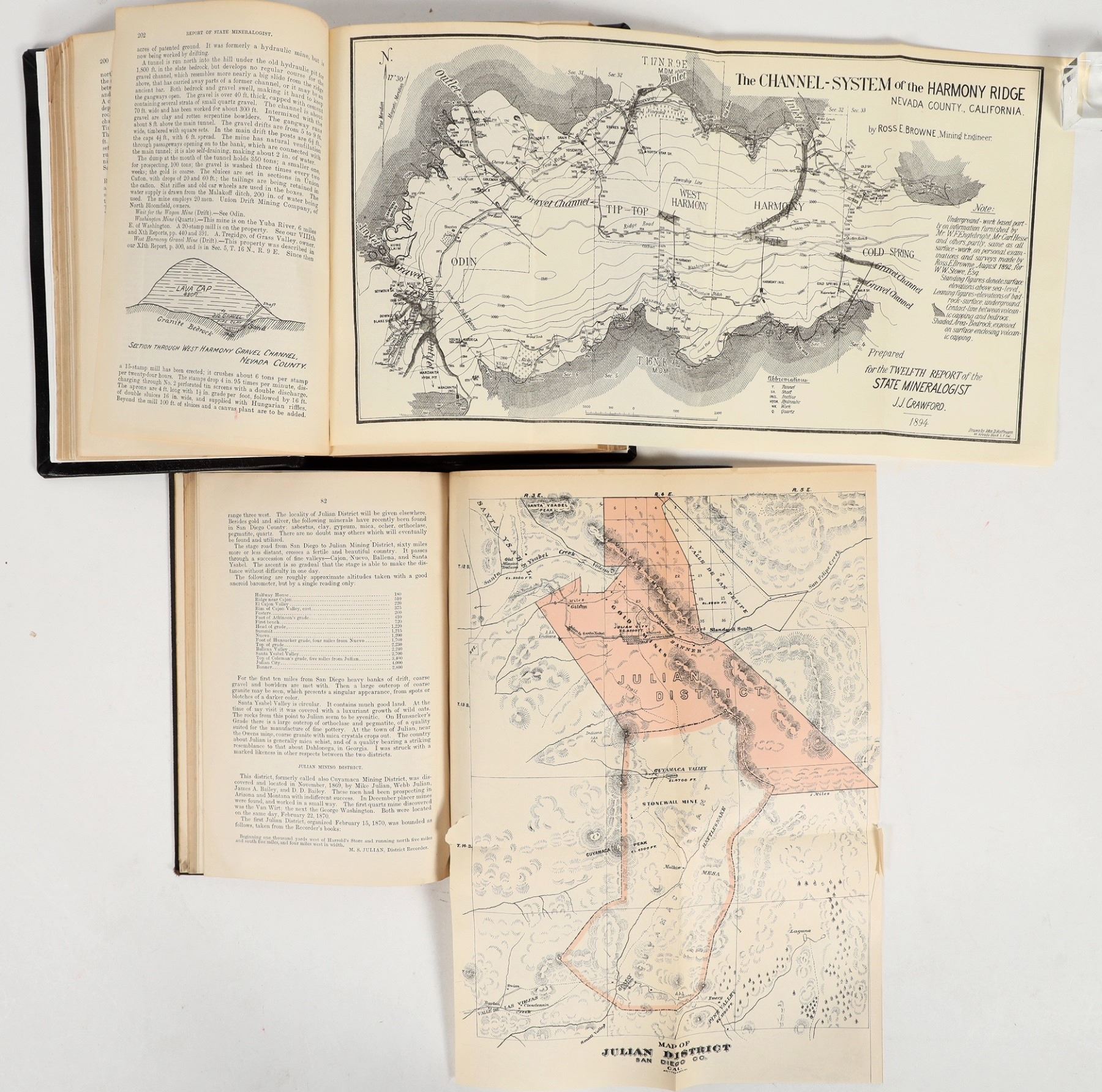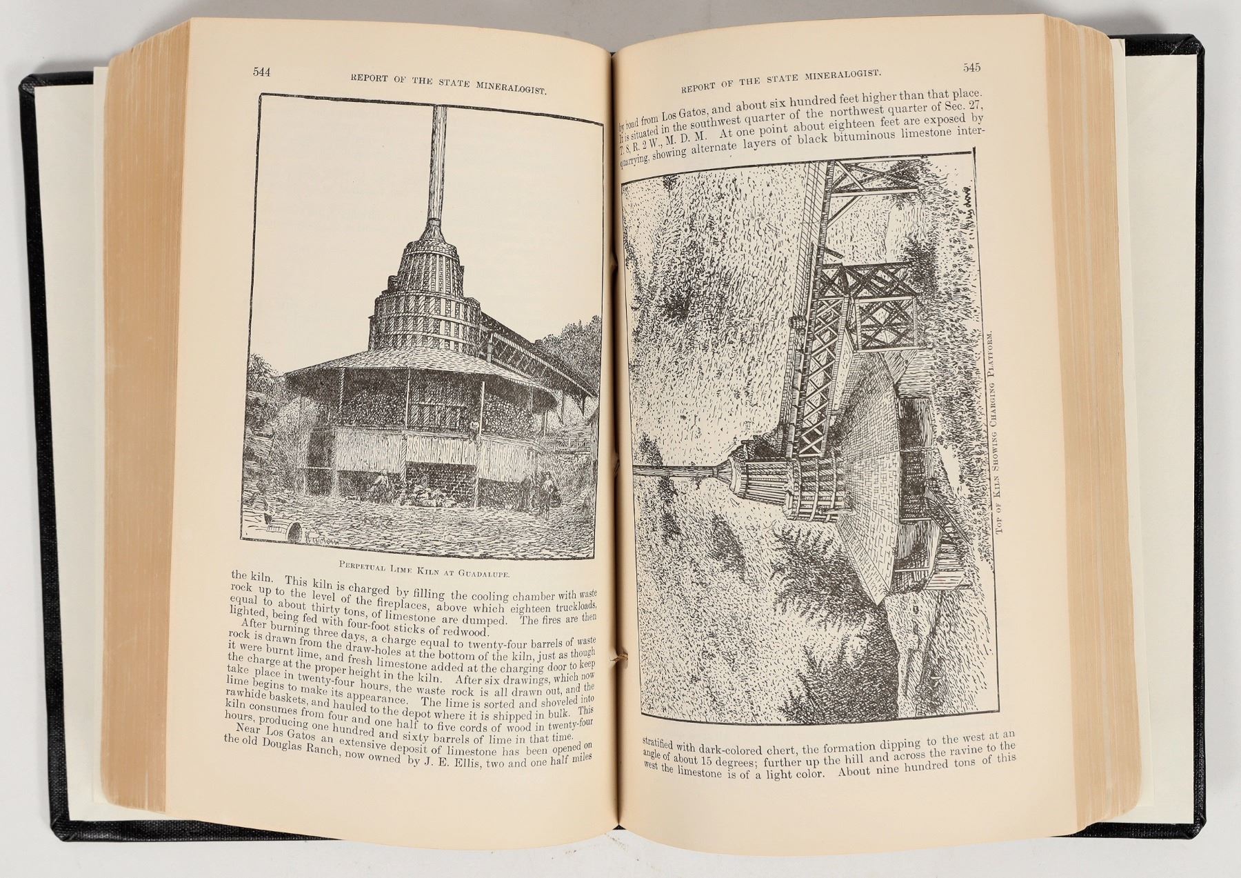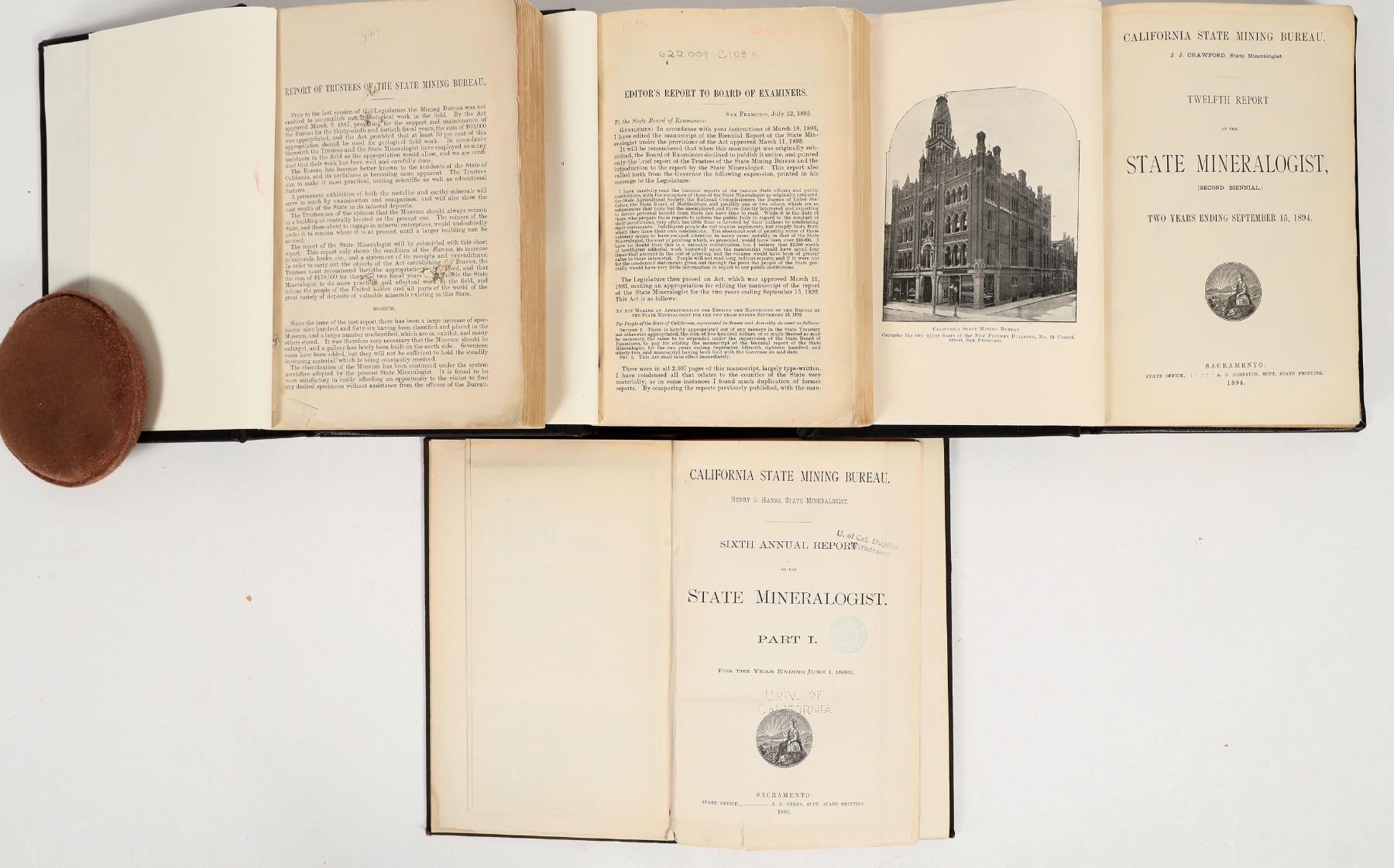 Group of 4 annual reports of the California State Mineralogist, published by the California State Mining Bureau, published 1885 to 1894. Reports included in the lot are the 6th, 9th, 11th, and 12th annual. All four are hardback, all have black fabric binding w/ gilt text. 6th annual report appears to retain original binding, with the other 3 likely rebound. Condition varies between volumes; see photos. This could be an indispensable reference group for historians or researchers of California mining.