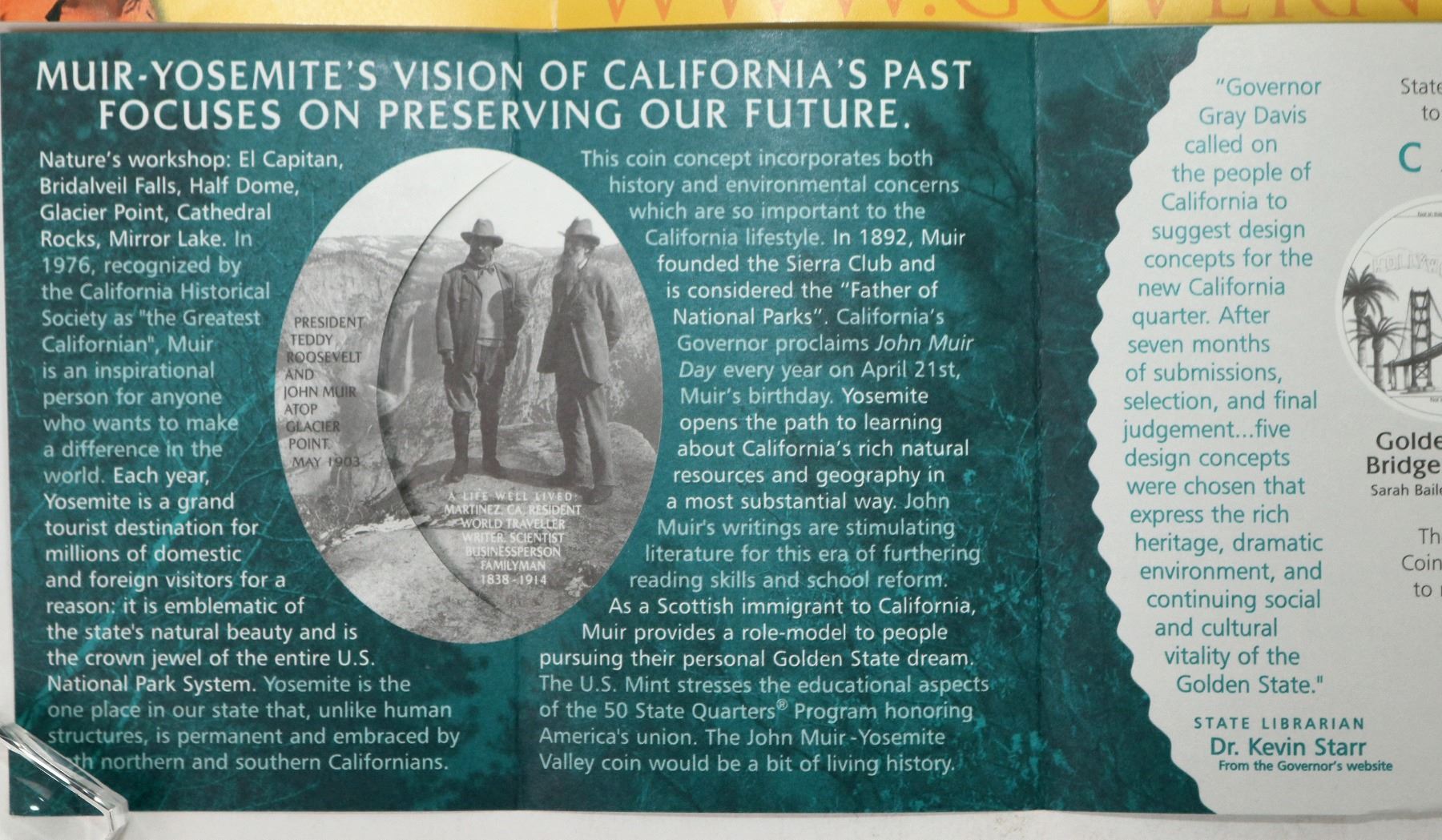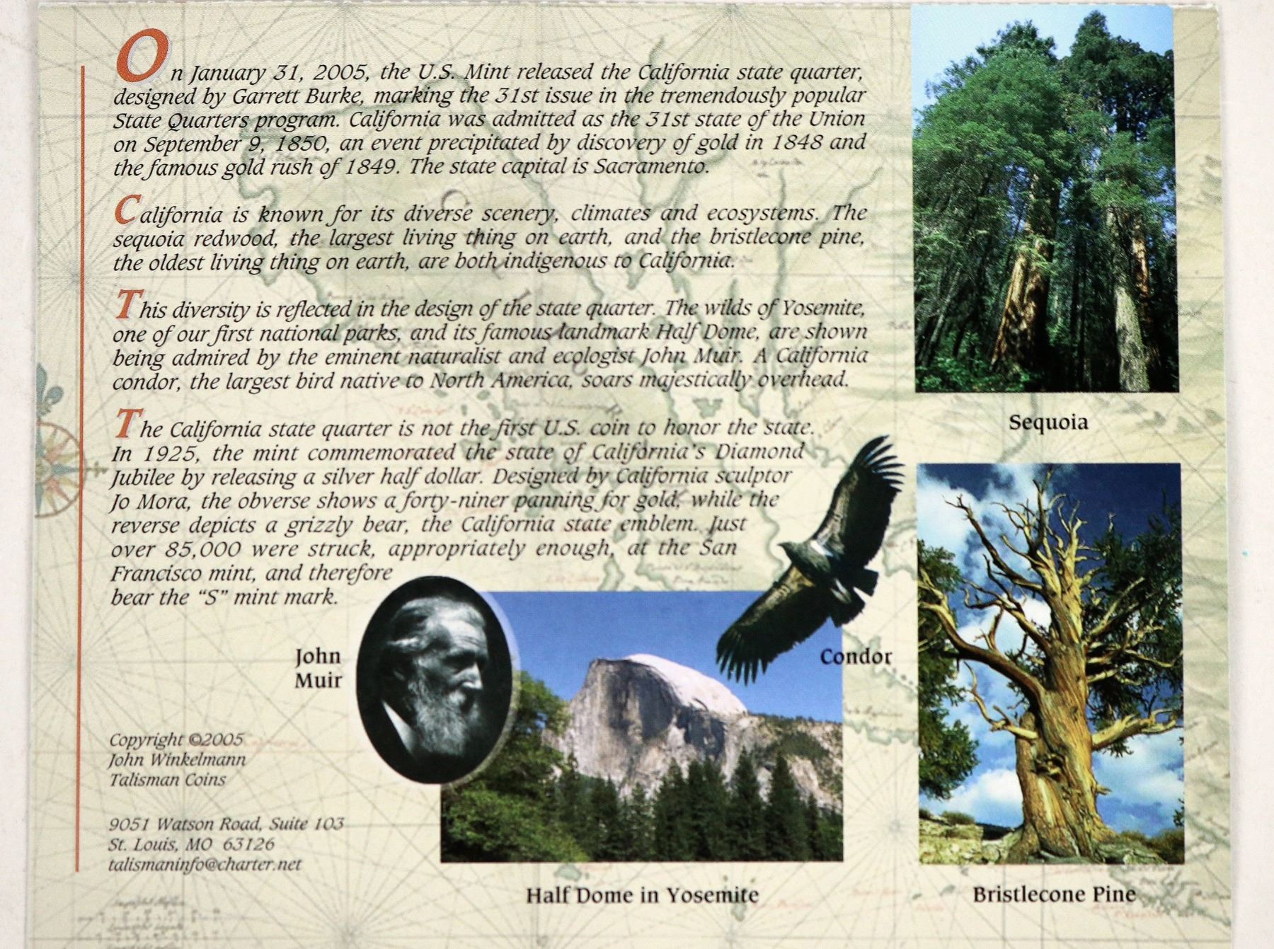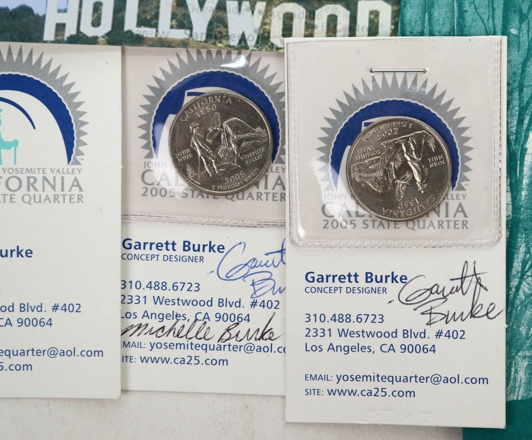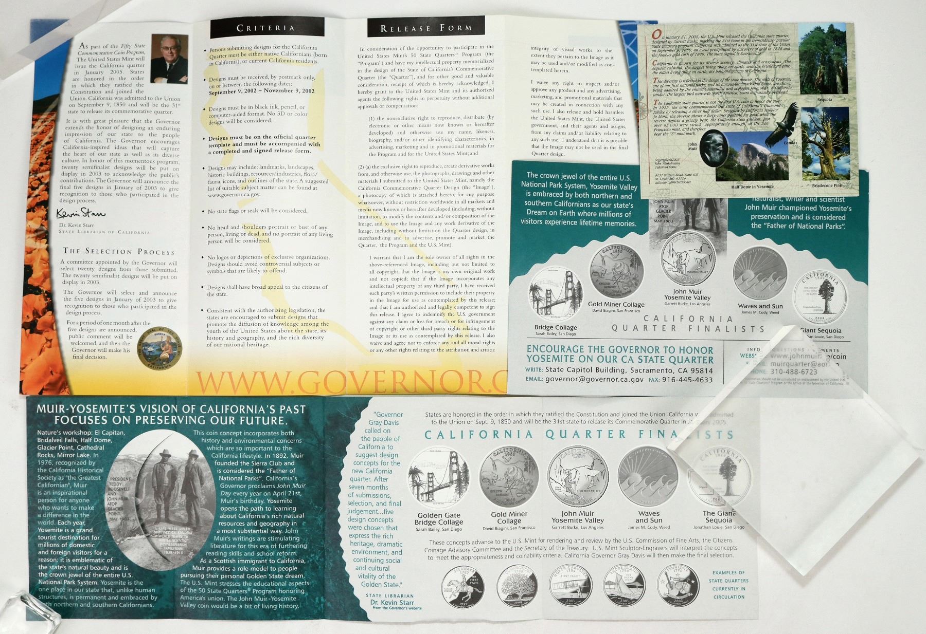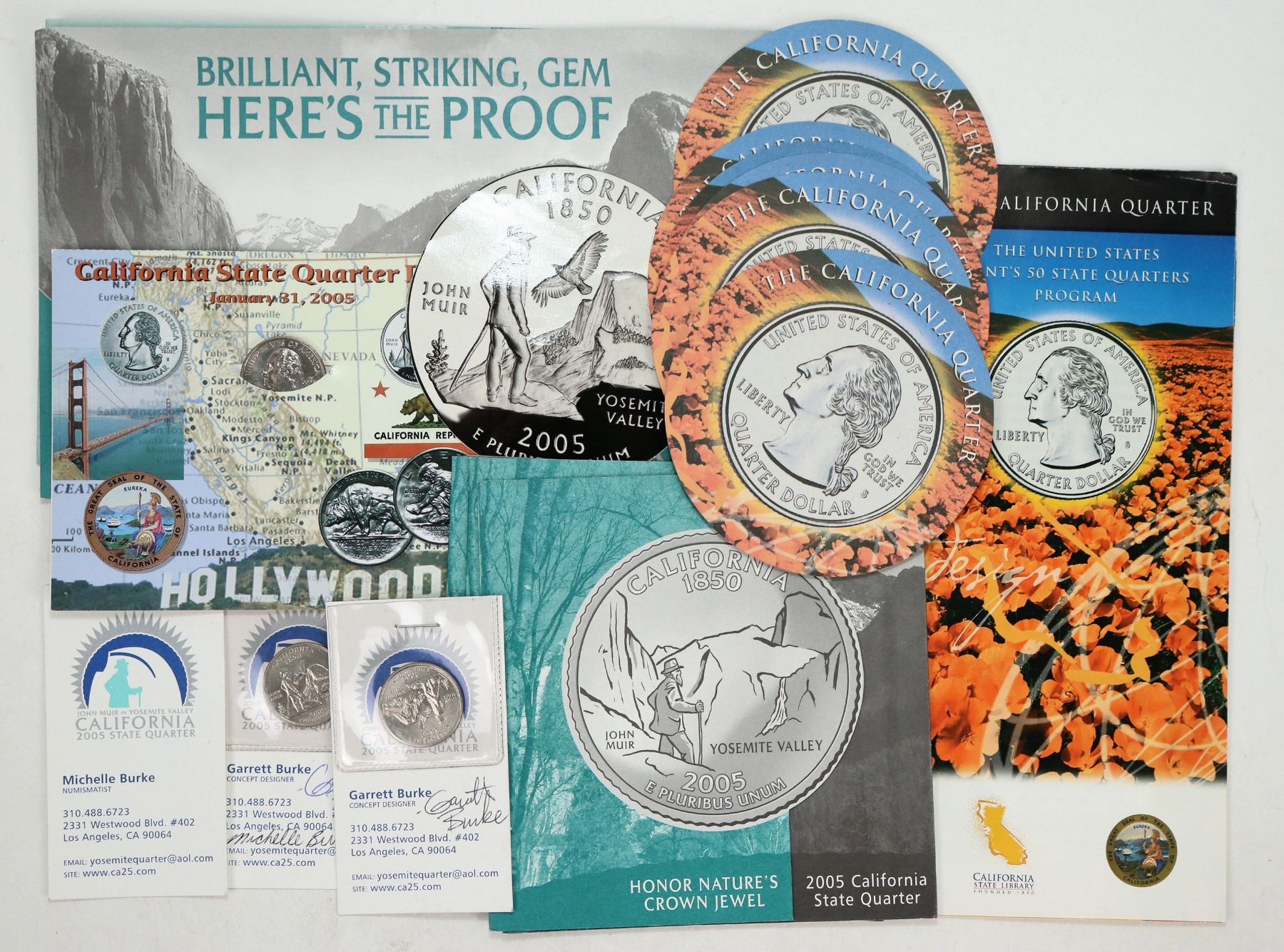Dr. Kevin Starr, State Librarian of California held a design competition for the California state quarter which was released in 2005. This collection has two application brochures explaining the design criteria; doodle coasters; four brochures with the five final designs; two examples signed by Garrett and Michelle Burke winning designers; and card from the January 31, 2005 California State Quarter Debut.