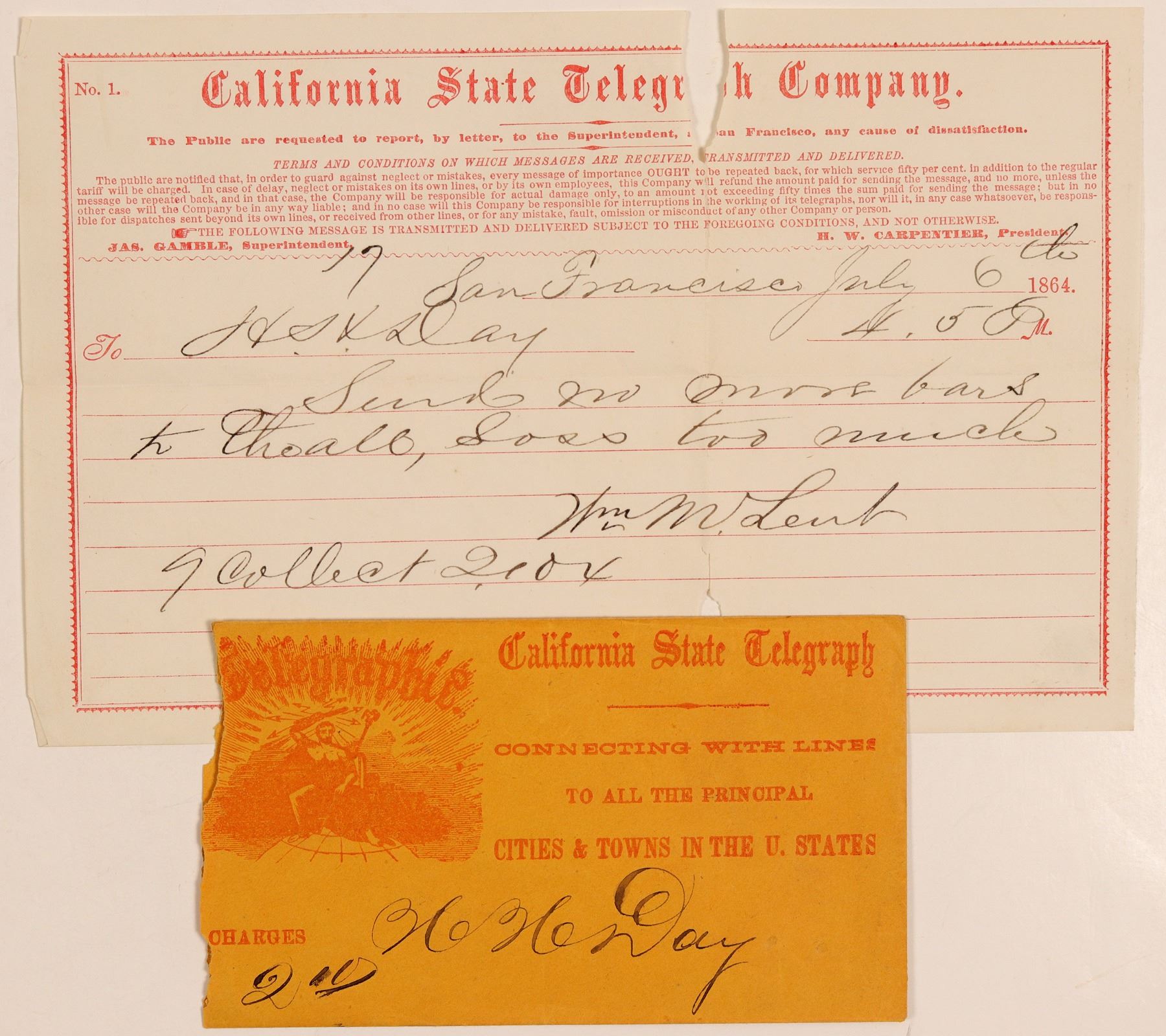 Territorial. Includes a California State Telegraph envelope address to Day. Telegram is dated July 6, 1864. "Send no more bars to Theall, loss too much." Theall was an assayer in Virginia City. Day was the superintendent of the Mexican Mine. He would also be connected to the Ophir Mine and Mill. Lent is a forgotten, but extremely important investor on the Comstock. Many (perhaps most) important mines at one time or another received financial support from him.
