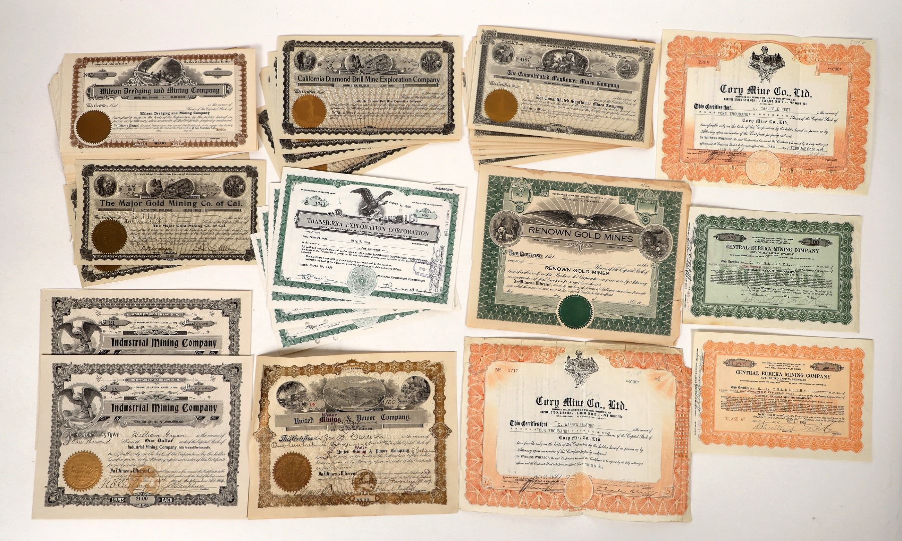 Issued and unissued stock certificates from California mines, including Wilson Dredging and Mining Company, Transierra Exploration Corporation, United Mining & Power Company , California Diamond Drill Mine Exploration Company and more. Please see photos for more details.