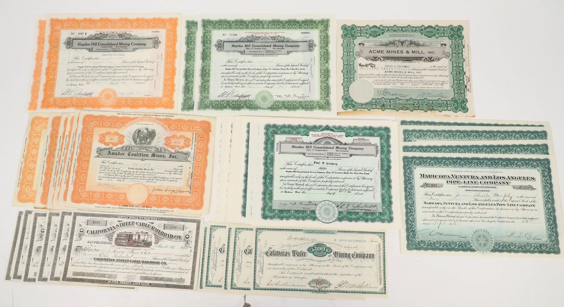 California Mining Stocks, 7 Different c.1890s-1952 includes Calaveras Water and Mining Company (9) California Street Cable Railroad Co. (7) Acme Mines & Mill (1) Maricopa, Ventura and Los Angeles Pipe-Line Company (4) Hayden Hill Consolidated Mining Company-3varieties: about 40, Amador Coalition Mines,(8)