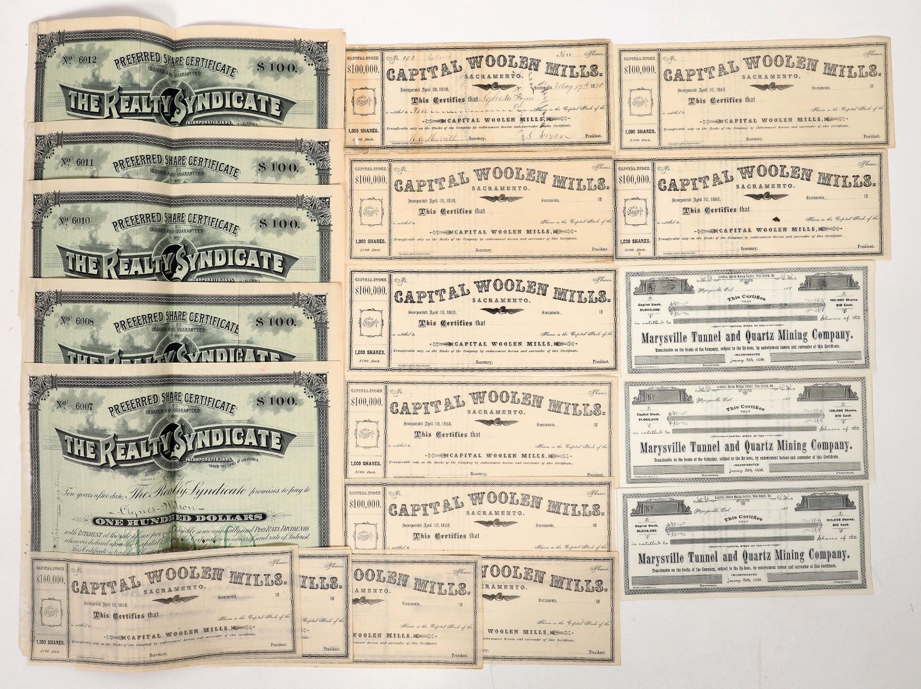 A collection of 20 stock certificates from various California companies, dating from 1878 through 1897. These companies are the Marysville Tunnel and Quartz Mining Co. (3), Capitol Woolen Mills (11), and the Realty Syndicate (6). One Capital Woolen cert and all Realty Syndicate certs are issued; all others are unissued. Issued certificates are each signed by secretary and president of their company. The Realty Syndicate certs also have embossed company seals. Marysville and Capital Woolen certificates are in good condition; Realty Syndicate certificates are more heavily creased with a few showing heavy wear around the edges.