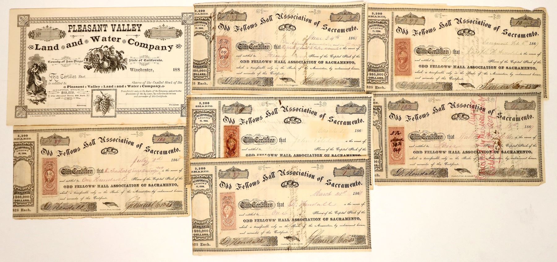 A group of eight stock certificates from California companies, dated from the 1860s to the 1880s. Seven of the stock certificates are for shares in the Odd Fellows Hall Association of Sacramento; each of these is signed by the president and secretary of the company and has a 25¢ IR stamp attached, and several have been cancelled. The remaining certificate is for the Pleasant Valley Land and Water Company of San Diego, and is unissued.