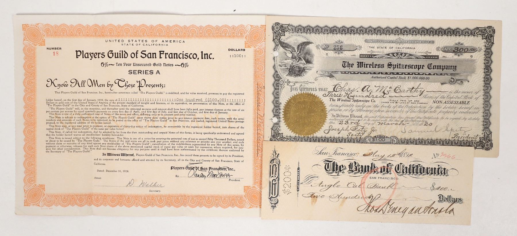 This lot has 100 shares of The Players Guild of San Francisco issued 1928. A stock for 300 shares of the Wireless Spitzescope Company dated 1920. A bank note for $200 dated 1892. Please see photo for details.