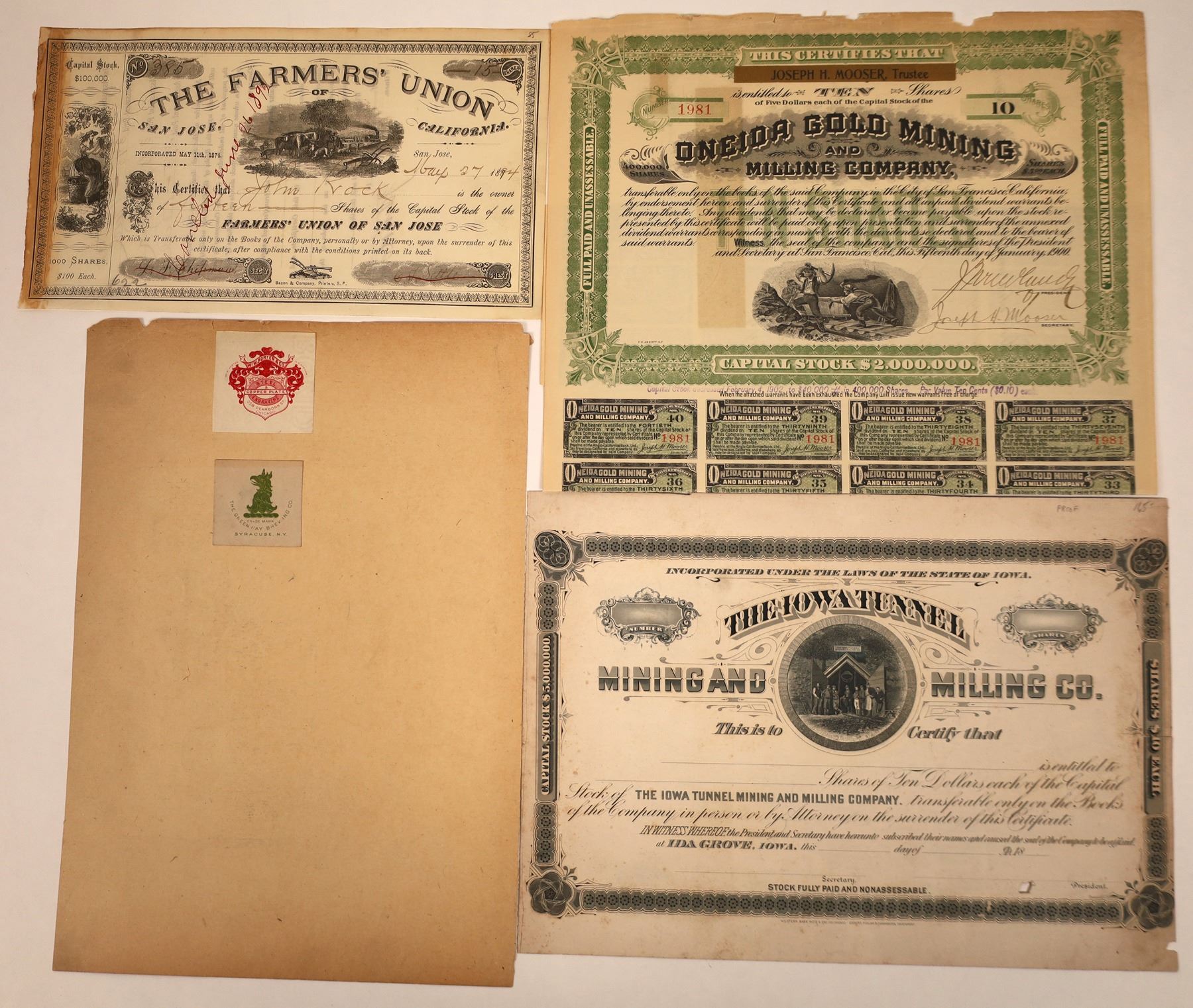 First, we have a Proof certificate from the Iowa Tunnel Mining & Milling Company, printed on thick paper by Western Bank Note & Engr. and Ebbert, Fidlar & Chambers, Davenport, IA. Great vignette of miners posing outside the mine portal. We are guessing this company might have operated at Iowa Hill, near Colfax, in Placer County. Rough condition on the right edge. Engravings Company labels on card attached to the verso; 2) Oneida Gold Mining & Milling Company, (CA), 1900 with coupons. Rough top edge. 3) The Farmer's Union of San Jose, California, 1894. Brown left edge where stub was removed. Pen canceled. California
