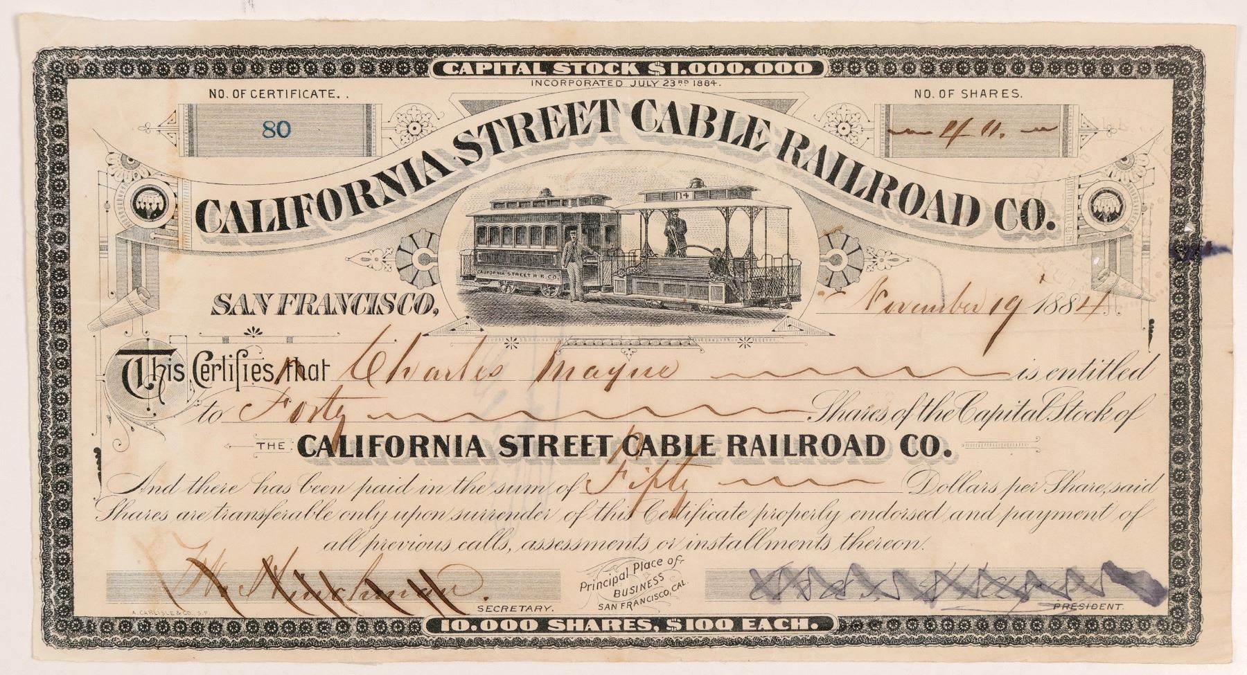 San Francisco Cable Car Stock! No. 80, 40 shares to Charles Mayne I/C, Secretary & President's signature blocks have been blacked out. Nice vignette of cable car.