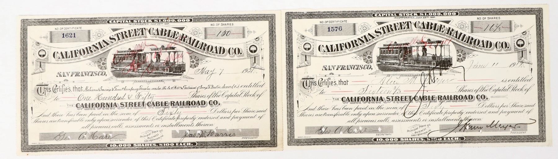 Lot of 2 issued 1919 and 1921, two different presidents (Meyers and Harris). Both pen and punch cancelled. Nice vignette of San Francisco street cable car. Inc. 1884.