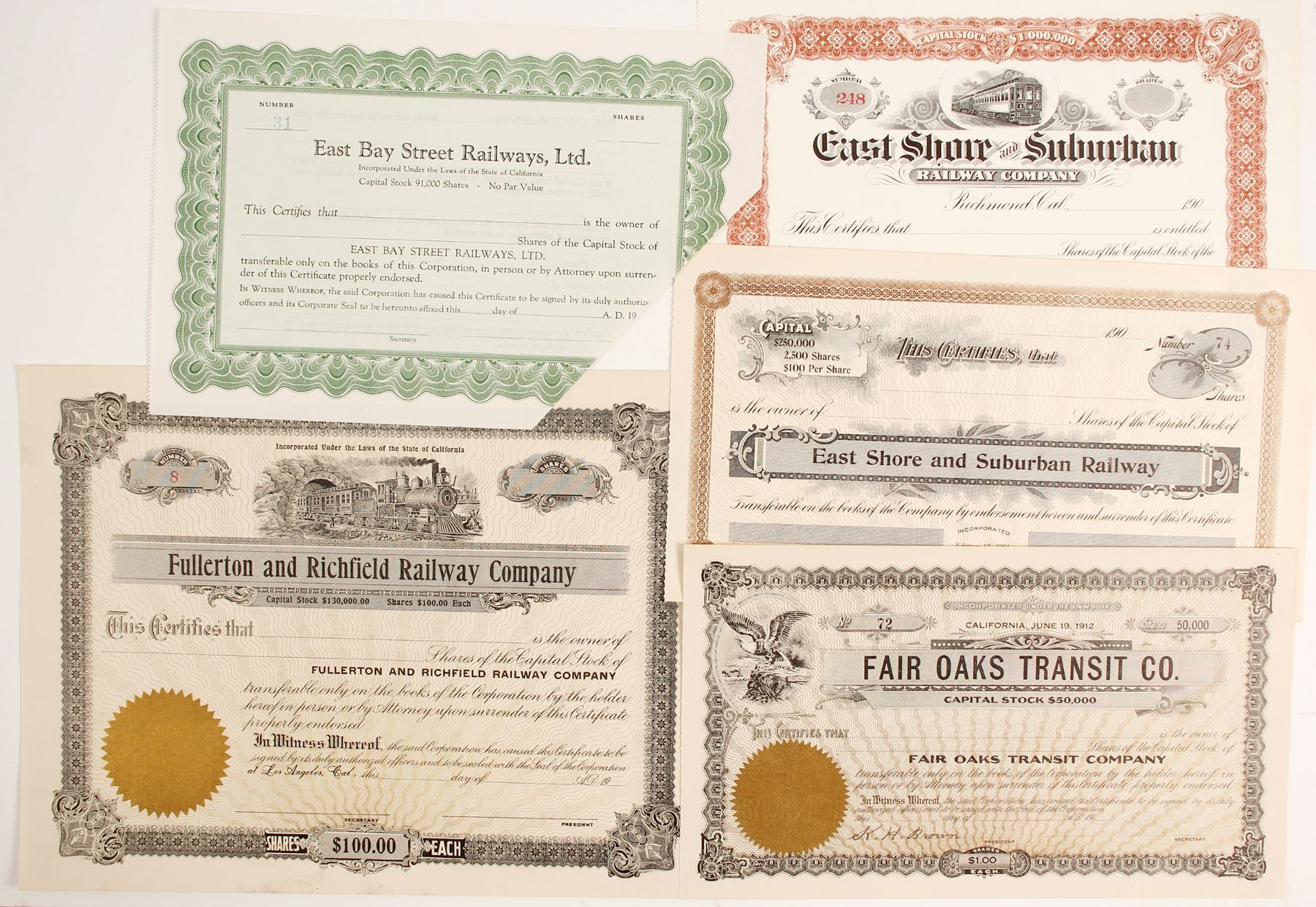 CA Street Railway - 5 stocks: 1) 2 - Unissued and uncancelled stock from East Shore and Suburban Railway cert # 74 & 248. Formerly independent unit of the historic San Francisco Bay Area Key System which ran streetcar trains in Richmond, California, San Pablo, and El Cerrito. 2) Unissued and uncancelled stock East Bay Street Railways, Ltd. cert. # 31. bottom right corner missing. Wood and steel streetcar, built by the St. Louis Car Co. in 1911. Seats 48 passengers, one operator. 3) 50,000 shares at $1 each of Fair Oaks Transit Co. cert. #72. Inc CA on June 19, 1912. Signed K. H. Brown, pres. Present time, Fair Oaks is served by Sacramento Regional Transit District, which has no light rail stations in the area Printed: Goes. Prag collection. 4) Unissued and uncancelled shares at $100 each of Fullerton and Richfield Railway Co. cert #8. Fullerton and Richfield Railway started operations in 1910 and stopped service in 1911 operating in only in the state of CA, which sometimes happens with smaller lines. Printed: Goes. Prag collection.
