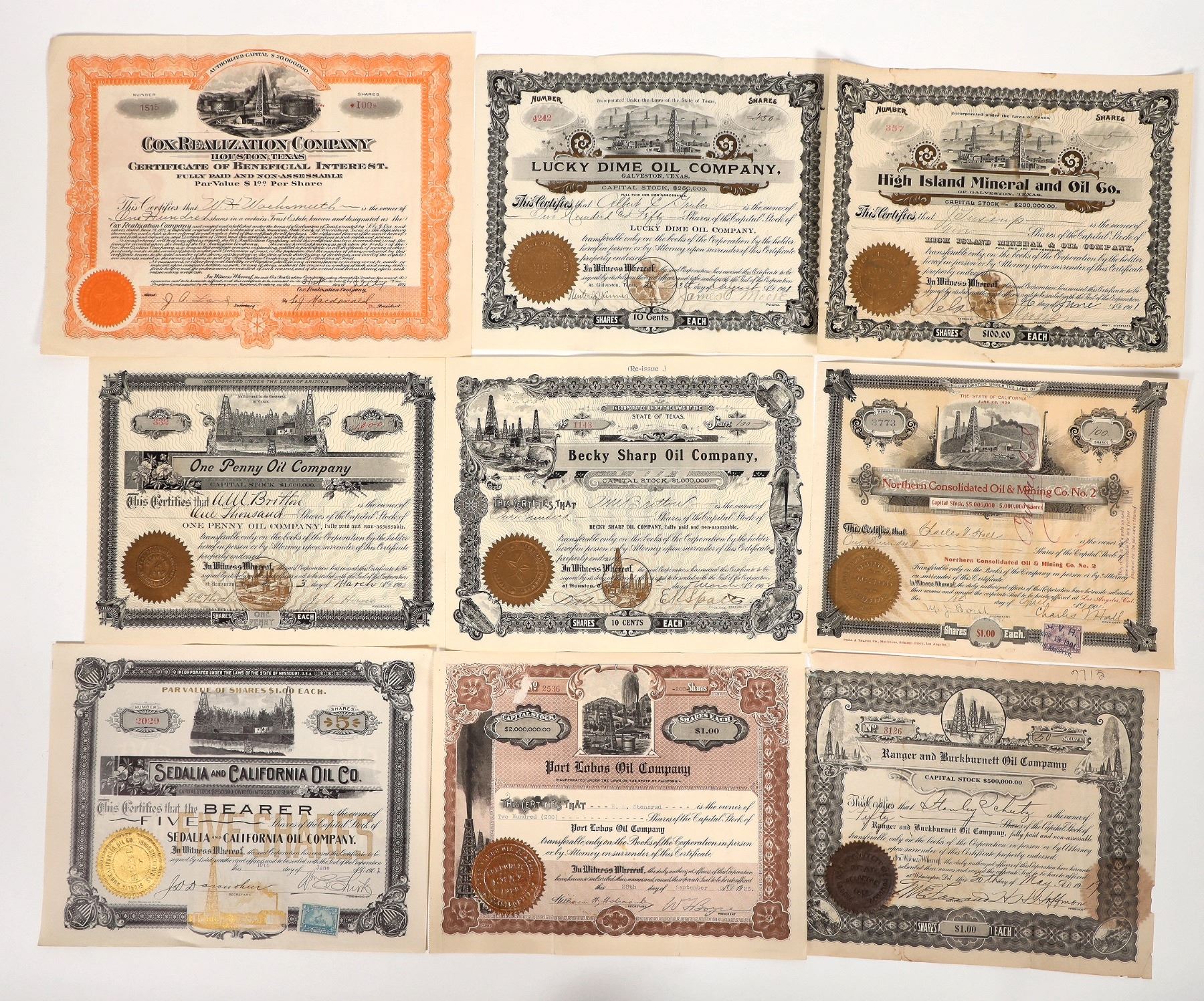 9 California and Texas oil stocks, 1901-23 with oil vignettes. Ranger and Burkburnett, Cox Realization, Lucky Dime, High Island Mineral and Oil, One Penny, Becky Sharp, Northern Cons. Oil & Mining, Sedalia and California, Port Lobos.