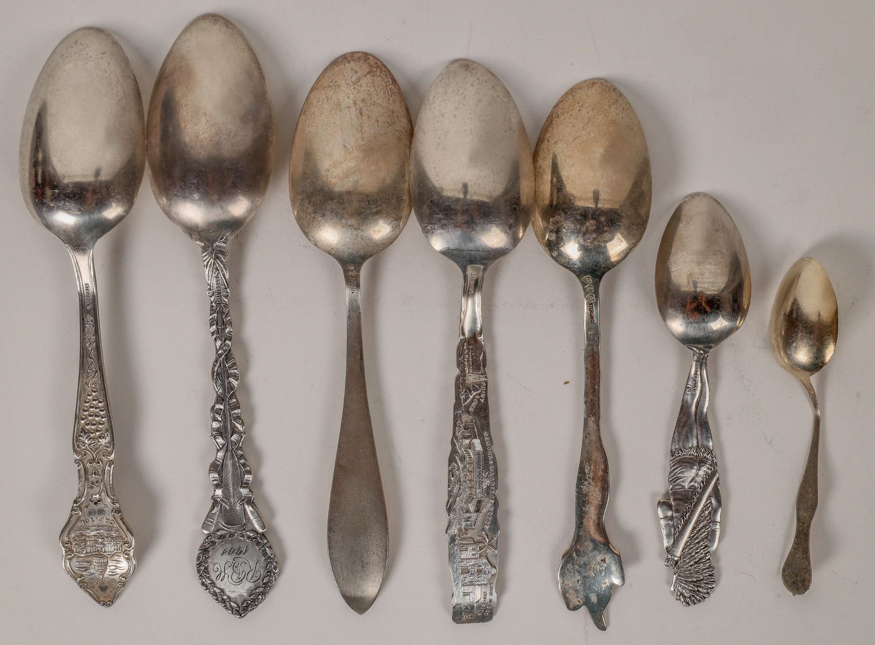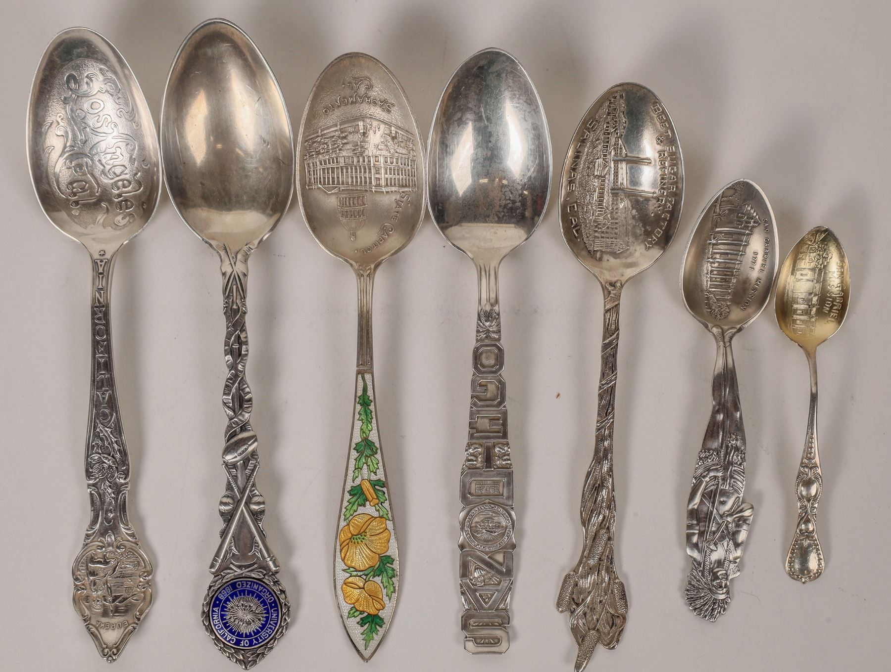 Sterling silver souvenir spoons with California locales (7). Included are Salinas, San Diego, San Gabriel Mission (2), University of California, Sacramento and Los Angeles. All are very shiny but could use some polish. Please see photos for more details. 1901